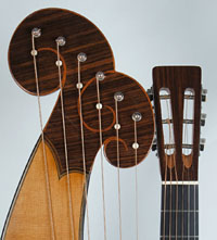 Trust me, this is not a wimpy instrument). Fit and finish is similar to his last. Despite the great design aesthetics and overall execution, it is not flawlessly presented. The top is nice, though not pristine in figure (I find that the imperfections - which are enhanced by the dark lacquer - nicely fit the vintage appearance). There are a few minor marks, dings and scratches throughout (see for example the lower left photo: small, shallow marks that show up in certain light). The French polish, while beautiful from a few feet away, is of average quality. One could give it another final expert touch up and perhaps perfect it, but I'd leave it alone. There are no fretboard markers, due to lack of available materials. There are 4 tiny holes ready for micro-dot markers at the 3,5,7,& 10 fret positions, but I did not have them installed - figuring better to let the buyer put in their own choice as desired. Nut/string width: the neck at the nut is 1-15/16" as a Dyer. The string spacing however is narrower, with E string centers at 1-9/16" - meaning that there is more space from the string (especially high E) to the edge of the fingerboard. To me, not a big deal. The customer can either play as is, or put in a new nut that is narrower or wider, as preferred. Once nut and strings are dialed in, the neck itself could even be thinned if desired. As I prefer a wider vintage nut spacing, I'd simply replace the nut and go. But this is perfectly playable as is. I haven't messed with the truss rod, as action is good and intonation perfect. Neck tuners are nice (the new Stew-Mac "Vintage" nickel tuners), and we again used Gotoh 4:1 tuners for the subs. (NOTE: I had temporary Stew-Macs on for all but the 3 close-up photos of the back of the headstock) Arul drilled slight recesses for these, as he wanted to leave the headstock an extra 1/16th inch thick (not a bad idea, actually). The nut posts are a bit lower than typical, about 1/4" in height. This shallow sub-bass position is great for line-of-sight while playing, but might need to be raised for perfect tone and if one plays hard (as I do). That's about it. Some minor imperfections that hamper the otherwise great quality of Arul's work, but allow you to get a great deal. At this super-low price, I would absolutely "bless it" as a professional workhorse harp guitar. - Gregg Miner, the "harp guitar pope" |