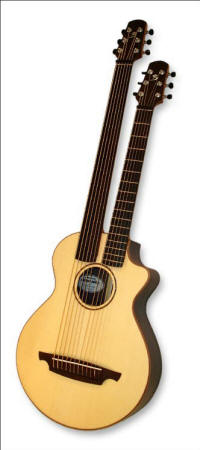 Well, someone finally went and did it. While I was brainstorming with several luthiers on how to fold that pesky Dyer arm in half, a fellow named Luke Brunner over in Switzerland built a better mousetrap. The first genuine portable travel harp guitar by Brunner Guitars! And now, forget everything you've read, heard or thought about travel guitars, because this blows them all away. A) It's not cheaply built, B) it's not too small, and C) it doesn't sound lame. It does disassemble (in literally seconds) and stow in an adorable little backpack gig bag, and can fit in most airline overhead compartments. And don't think of it as a "kit" guitar either. Though it separates into three pieces, it assembles quickly, cleanly and solidly - with almost no re-tuning required! Once assembled, what you've got is a finely crafted, professional, full-scale, small-medium bodied harp guitar....that sounds fantastic. Impossible you say? OK, check this out: First, listen to an unadulterated A/B/C comparison of the two instruments shown here compared with my vintage Dyer (below). Then, later, read the full story Lukas Brunner and the World’s First Travel Harp Guitars on Harpguitars.net. In that feature, you'll see how I was originally highly skeptical myself. You'll also understand the array of unusual, innovative features that Luke has developed to provide such amazing sound. By dumb luck, just after these arrived, the maestro himself, Stephen Bennett, stopped by for a visit. He was initially disbelieving, then tickled to see how it magically assembled. Then complete surprise when I handed it to him and it was virtually in tune! After playing each for awhile, we both admitted that we wouldn't have any problem with owning one of these - for touring, recording, anything (the price is certainly right). Our only personal caveats were the string spacing - a bit less at the nut and saddle than the Dyers we're used to - and of course the fact that we each had a fantastic harp guitar (actually, a few) already. The string spacing is of course just an observation, not in any way a negative; I readily acknowledge that the nut width preference of harp guitarists ranges from skinny Taylor widths to the full two inches of the Lark in the Morning. OK, let's discuss these in detail. These are OHG # 2 and # 3, serial numbers 163 and 164. Philippe Fouquet in France has the first one (he was the instigator of the whole serendipitous project). As the photos show, #163 (right) has a spruce top with Indian rosewood back and sides, while #164 (left) has a cedar top with mahogany back and sides. 164 was deliberately left as unadorned as possible in order to offer the public the most affordable OHG option we possibly could (price is $3500, tone is a good $7k equivalent). 163 has mid-range options - a cutaway, a sound port (I love this - it gives the impression of a hollow arm), electronics (Baggs), and wood bindings. Otherwise, they are virtually identical, each having near-identical construction, the Brunner truss rod, locking tuners, pearl headstock inlay, side fret markers, and six sub-basses (strung and tuned in Bennett tuning). For the latter, there is a larger hole drilled in the bridge for the last sub to accommodate the large ball of an acoustic bass string (i.e: one can use a .100 to get a low F or E. Currently an .080 - of either ball size - handles the low G perfectly. In fact, Luke put an .072 on # 164 and it sounds pretty good). Note: Although Philippe Fouquet has left his OHG assembled and tuned for several weeks at a time, the manufacturer recommends that the Outdoor Harp Guitar be kept disassembled in its case when not being played regularly in order to reduce long-term movement of necks, joints or top. Depending on your ultimate chosen tuning and string gauges, you may wish to make eventual adjustments to truss rods or saddle height. The scale on this "portable" harp guitar is a full standard 25-1/2" with a 1-3/4" nut width. The sub neck has a 30-1/2" scale (equivalent to the B or 4th sub of a 6-bass Dyer), a perfect compromise to handle a Bennett tuning of low to high G, or Fouquet's tuning which descends from D to F. Each has a zero fret. (If you're thinking of playing the second neck as a fretless bass or baritone guitar to flaunt a potential harp guitar organology challenge in my face, I've already thought of that! It might actually be cool. However, the necks are too close together for that to be practical.) The original Outdoor Guitars had a portable 12-1/4" wide body. Later, a second larger body size was added to the line. The harp guitars have this generous 14-1/2' body with plenty of depth (4" - same as a typical Dyer). Again, it's not the size or materials, it's how Luke has put it all together. For a complete (and fascinating) look, please visit my companion piece. Let's talk a bit more about the way the instrument comes apart and goes together. The key is the S.N.A.P. system (Simple Neck Attachment Procedure) that Luke invented and patented. This clever contraption holds the neck in position with a simple "click." By tightening the strapholder, the system is fully secured and the neck is pulled tight to the body. It comes apart just as quickly and easily. The bridge is in two parts, one glued to the body as normal, the other a removable section in which the string balls are captive. This, along with a special "through" nut and locking Gotoh tuners at the other end, allow the strings to stay at tension during assembly and disassembly. It really works! Luke recommends that the instrument be disassembled and kept in its case when not being played for long periods of time, to extend the life of the set-up and normal movement-over-time of the wood. We now pause for this commercial break...