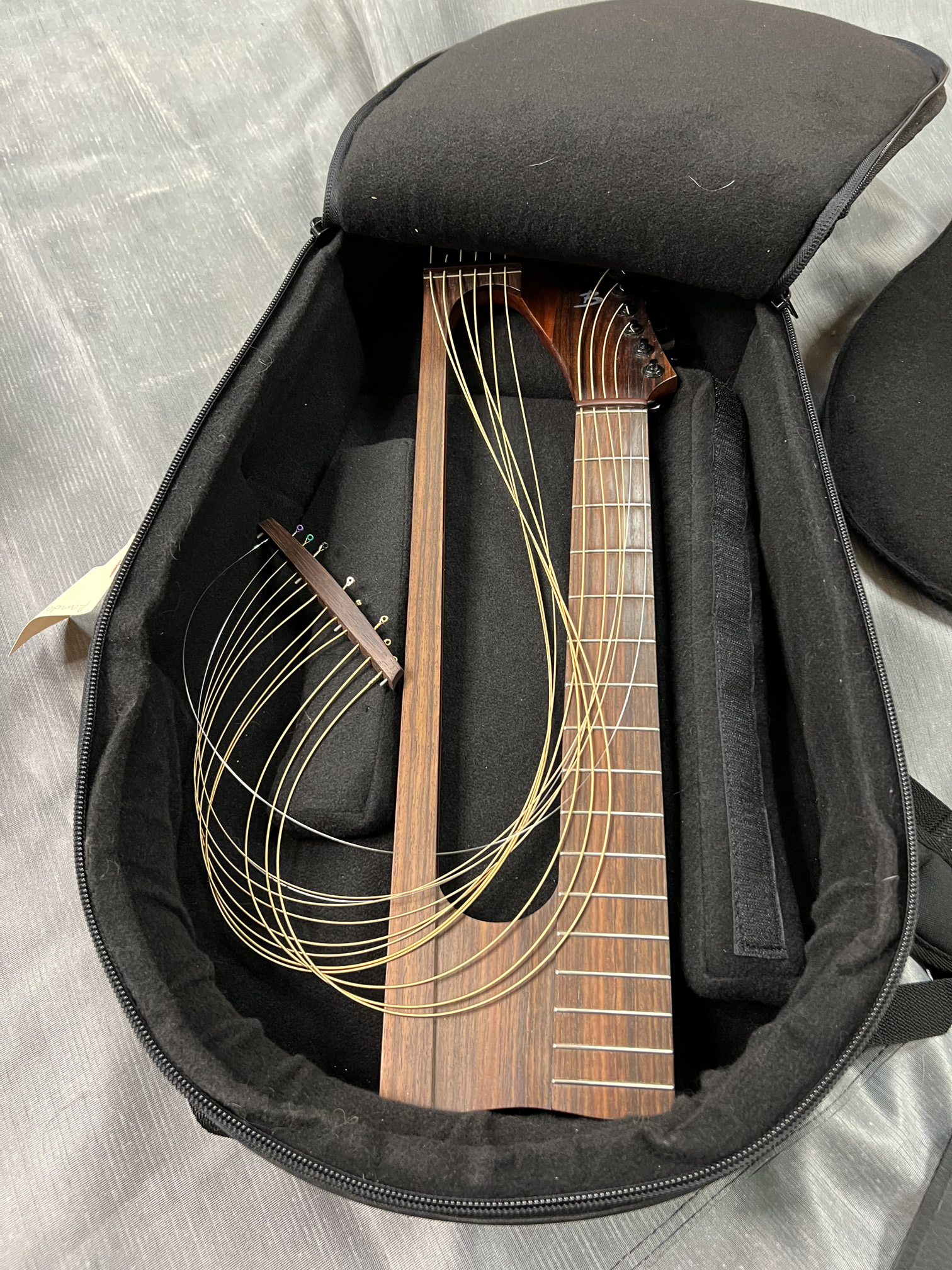In 2009, I sold the first Brunner "Outdoor" or Travel Harp Guitar in the United States. Along with the very first instrument commissioned by harp guitarist Philippe Fouquet, I had taken the chance and commissioned two of my own. I lucked out, as they sounded simply amazing. Especially for the small compact size. Yes, as seen below, these come apart for the airline's overhead compartment! According to the consignor (not the original owner), this beautiful instrument is in "Very Good +" condition. The label states 2014, but the original owner says they bought it new around 2020. Regardless, if you go today to the Brunner Guitars web site and run this model through their pricing system, you'll see that it comes to about $6600...if you pick up in Switzerland. So, anytime I can find and offer one in the States, I'm all over it. Just as I reviewed the original models in 2009, if you can live without the visual of a hollow arm, then get one of these, as they truly sound incredible. The current consignor (a repeat customer of mine) has multiple high-end harp guitars and agrees with me, saying, "it's miles ahead of Timberline, Tonedevil and Emerald." Seriously. The bass side port might even fool you into thinking you're playing a Holloway/Worland Dyer. And if you're not thrilled with the sound, then returning it won't be a huge issue due to its compact size. (Spoiler alert: Of the several hundred instruments I've sold since 2006, I've had exactly one return). So, yeah, I think you'll love it. Yes, it has electronics (tested), and you can plug it in and blow people off the stage, but the point of the instrument - besides the incredible bullet-proof disassembly and reassembly - is that they are wonderful acoustic instruments. You don't have to plug it in like an Emerald to feel and hear the sub-basses. This is a consignment listing that will be shipped from North Carolina. My full 3-day approval period applies (returnable at your expense). I urge you to also read both my original listing on the first models (though this one is much better) and also the fascinating story behind them. - Gregg (Sir Gregory) Miner |