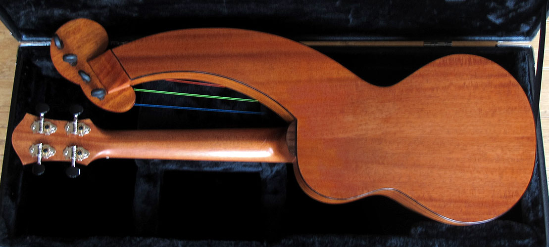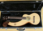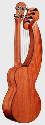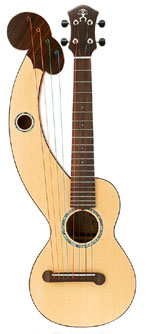 If you haven't heard about these or seen one of the YouTube videos from some of the happy owners, then you're in for a treat. London ukulele and harp guitar builder Pete Howlett started designing this instrument a year and a half ago (see Gregg's Blogg). He then collaborated with the aNueNue Ukulele Company, who ultimately produced a trial run of 88 last year. Just 20 of those were allotted to the States and immediately sold out. I bought one myself at full retail, as rumors were that that would be it. There was subsequently such a clamor that they did one more batch of 80 - and this, they say is the last time. Of those, just 12 came to the States and the distributor immediately sold out. I managed to get the last one. Price increased slightly due to materials, they say. PLEASE NOTE: Photos on the left are stock photos from the manufacturer; Photos on the right are the actual instrument in stock. You can see a couple of bear claw figure marks in the spruce top in this one. Quality, workmanship and sound are all good (made in Vietnam, best of the Asian manufacturers). Ready to plug in and play - all you need to do is figure out those extra strings! (Harp guitar players will have no problem). Basses are nominally tuned CDEF, though you can of course tune to whatever you like. I ended up putting much heavier nylon basses on mine (plus Nylgut for the neck, which dramatically improved the sound, IMHO). C'mon - it's a baby Dyer, you know you want it! (P.S. 2 top harp guitarists now own one, and come Fall, folks will be clamoring for these, mark my words.) - Gregg Miner, the "harp guitar pope" |