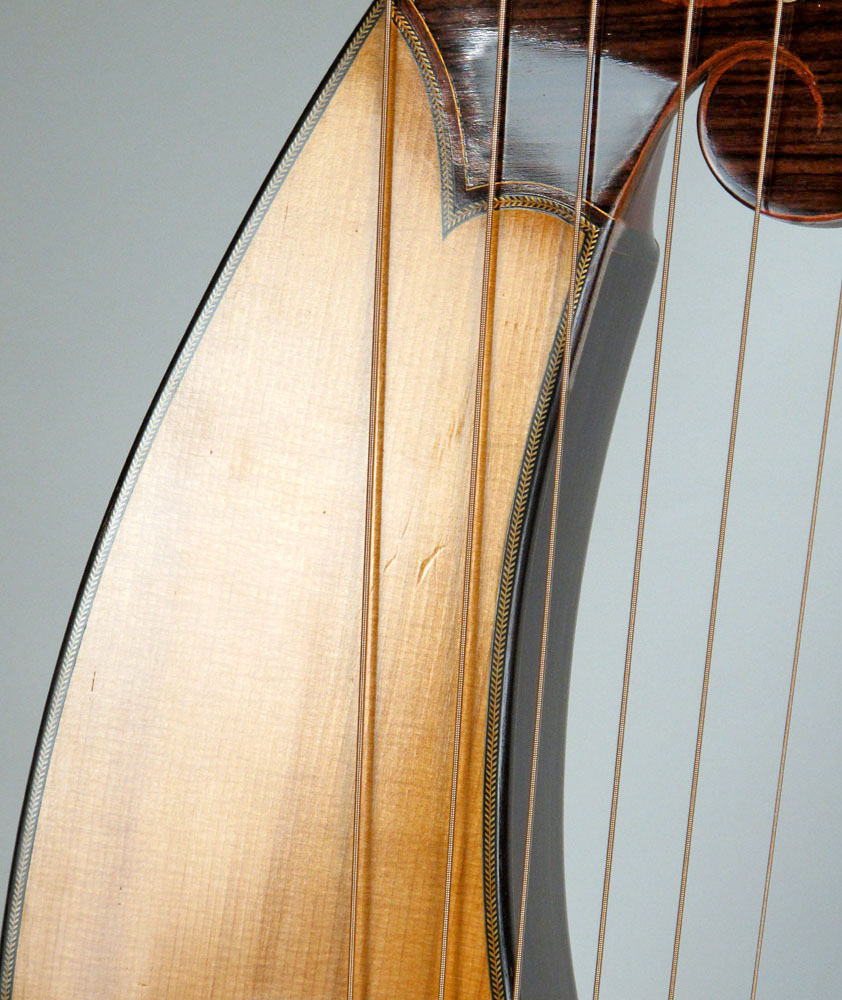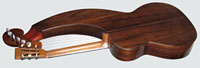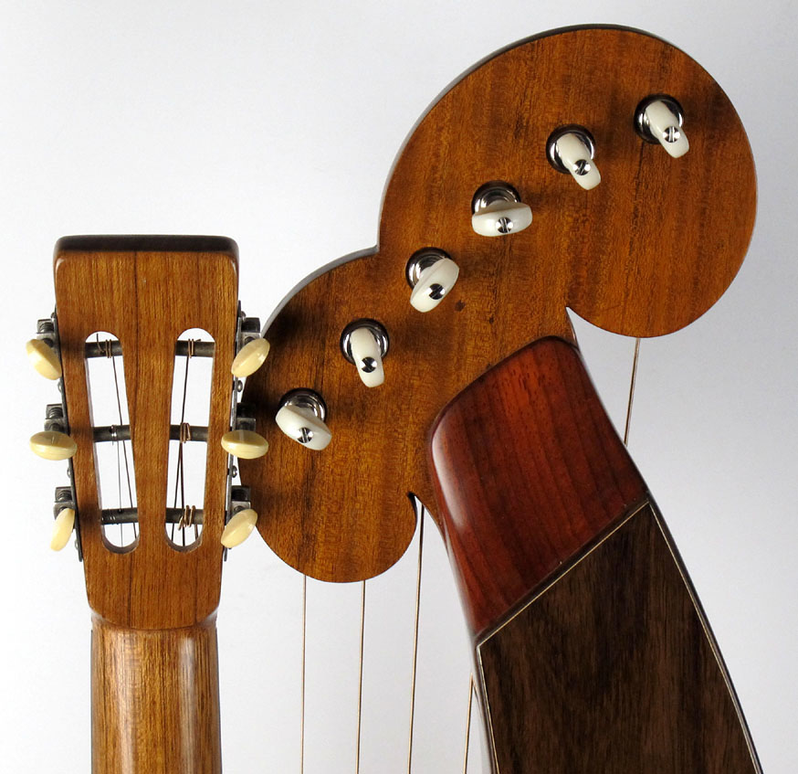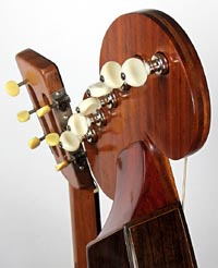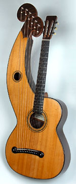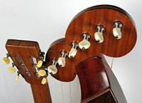 Trust me, this is not a wimpy instrument). Fit and finish is similar to his last. Despite the great design aesthetics and overall execution, it is not flawlessly presented. The top is nice, though not pristine in figure (I find that the imperfections - which are enhanced by the dark lacquer - nicely fit the vintage appearance). There are a few minor marks, dings and scratches throughout (see for example the lower left photo: small, shallow marks that show up in certain light). The French polish, while beautiful from a few feet away, is of average quality. One could give it another final expert touch up and perhaps perfect it, but I'd leave it alone. There are no fretboard markers, due to lack of available materials. There are 4 tiny holes ready for micro-dot markers at the 3,5,7,& 10 fret positions, but I did not have them installed - figuring better to let the buyer put in their own choice as desired. Nut/string width: the neck at the nut is 1-15/16" as a Dyer. The string spacing however is narrower, with E string centers at 1-9/16" - meaning that there is more space from the string (especially high E) to the edge of the fingerboard. To me, not a big deal. The customer can either play as is, or put in a new nut that is narrower or wider, as preferred. Once nut and strings are dialed in, the neck itself could even be thinned if desired. As I prefer a wider vintage nut spacing, I'd simply replace the nut and go. But this is perfectly playable as is. I haven't messed with the truss rod, as action is good and intonation perfect. Neck tuners are nice (the new Stew-Mac "Vintage" nickel tuners), and we again used Gotoh 4:1 tuners for the subs. (NOTE: I had temporary Stew-Macs on for all but the 3 close-up photos of the back of the headstock) Arul drilled slight recesses for these, as he wanted to leave the headstock an extra 1/16th inch thick (not a bad idea, actually). The nut posts are a bit lower than typical, about 1/4" in height. This shallow sub-bass position is great for line-of-sight while playing, but might need to be raised for perfect tone and if one plays hard (as I do). That's about it. Some minor imperfections that hamper the otherwise great quality of Arul's work, but allow you to get a great deal. At this super-low price, I would absolutely "bless it" as a professional workhorse harp guitar. - Gregg Miner, the "harp guitar pope" |