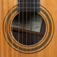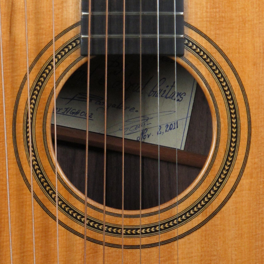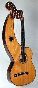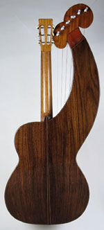 When my museum restoration person walked in and saw this, he immediately said, "Wow, what a nice vintage Dyer!" I felt the same vibe when I opened the box to find India's premier (only?) harp guitar maker, Arul's second instrument. Readers/shoppers may recall his first, which was to be the start of an ongoing business. Hopefully, it still will be. In the long interim, Arul has faced many struggles in preparing for production, not the least of which was a heart attack (and he's a young man) and a lengthy hospitalization. But now he's back and has created another unique handmade instrument. Despite a few minor imperfections, this is a pretty gorgeous harp guitar. The low price is for a couple of reasons: to sell as quickly as we can, and because of the couple issues which prevent this from being the $5000+ harp guitar that it both sounds like and looks like from six feet away. The Good: All solid woods, with an aged Sitka top supplied long ago by Fred Carlson and Indian rosewood back and sides. Beautiful Indian rosewood headplates, the bass head particularly so with its inlaid wood lines. Cedar neck with double-action LMI truss rod. Multi-ply Rosewood & Maple binding top and back with herringbone purfling on top and rosettes. Very lovely. Ebony bridge and fingerboard. Camel bone nut and saddles and bone bass nut posts. Professional tuners. Sitka spruce bracing. Entirely French polished with natural "button lac" which yields the rich reddish orange color on the entire instrument. Lastly, Arul gave a slight wedge to the body, with the treble side at the standard Dyer 4" and the bass side lower bout at 3-3/4". Yes, this