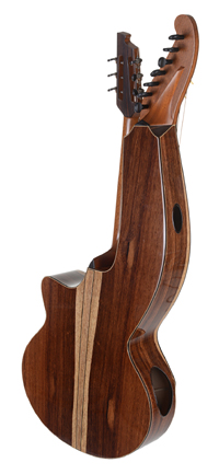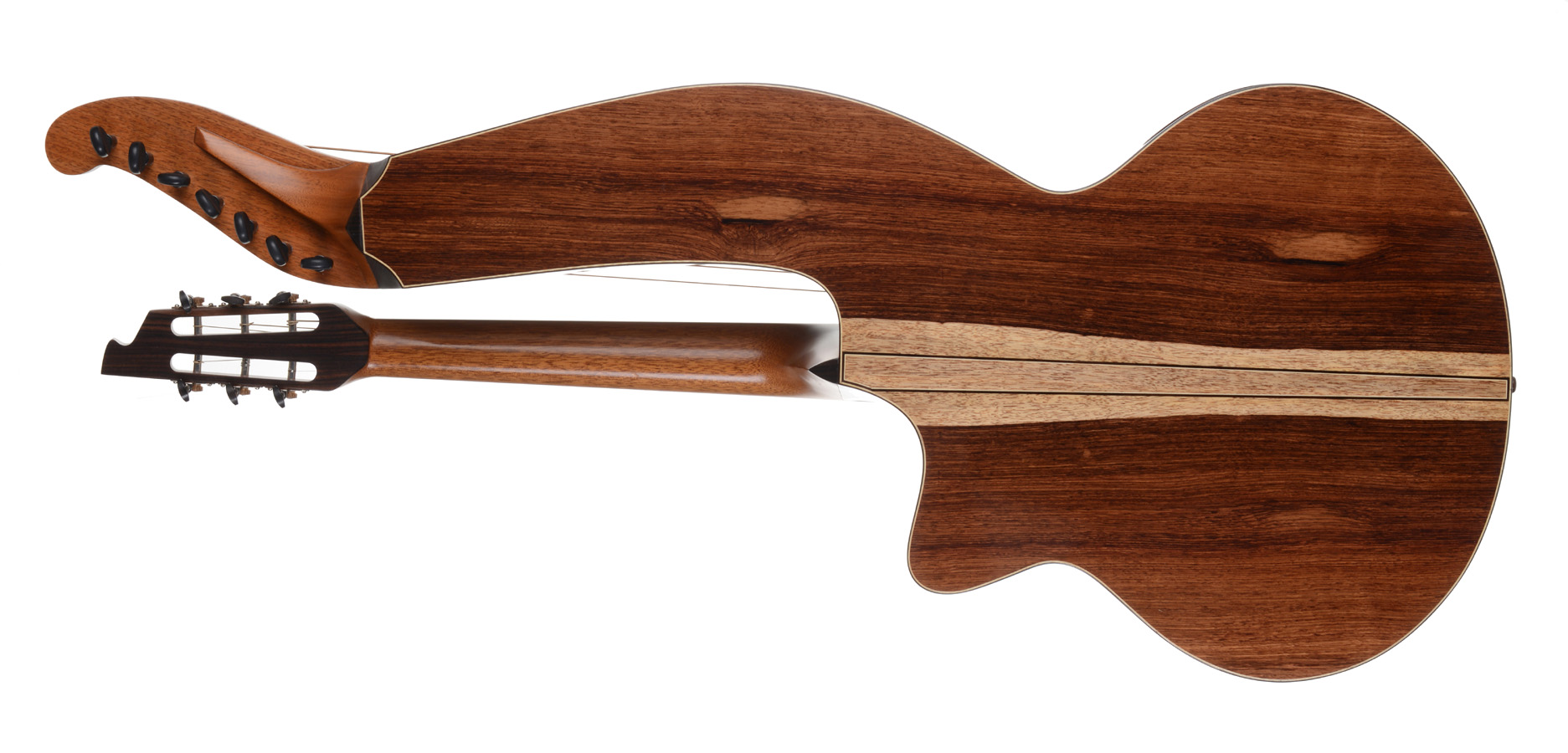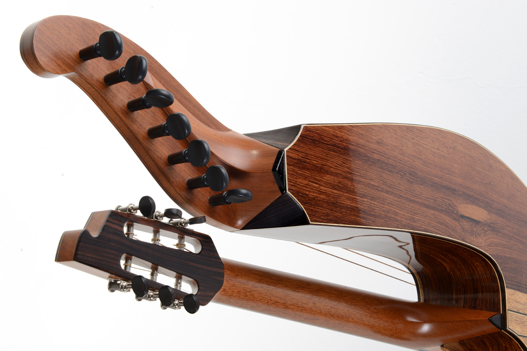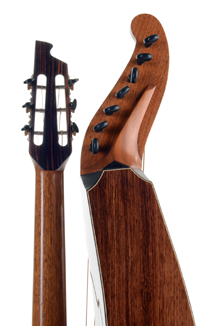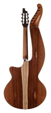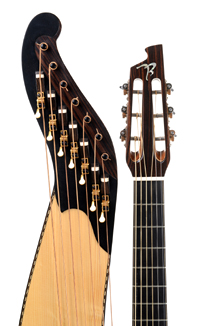 Even, balanced, punchy, full of sustain, it is simply wonderful.   Allan’s guitars and harp guitars typically display some gorgeous eye candy tonewoods. The Honduras Rosewood back with center sapwood on this one is simply fantastic. It sports a red spruce (Adirondack) top (with a clear pickguard), plus other fine wood choices for trim – lots of that, in just the right degree of tasteful design, color and ply. From those singular black & white-rimmed oval soundholes to the mini arm bevel to the subtle tapered body shapes in all directions (I cannot figure out the geometry) to the thin laminate lines sprinkled about to the wonderful geodesic join of the bass arm to the head (take that, Larsons!), the artistry and lutherie of Allan’s creation just keeps on giving. Fit and finish are a 10. Did I mention that Allan’s harp guitars supply a full chromatic octave below the neck? All it takes are 7 subs and sharping levers. Tuning (nominal, unsharped) is D down to E. The sub-bass Peghed tuners are wonderful, quick and lightweight. Please note that there are some players who just cannot get the knack of these, and I for one never understood why. They require just the slightest bit of in-and-out pressure to work smoothly; I'm a klutz and have never had a problem. They're lightweight and stylish and ideal for Allan's instrument. You'll see that the original owner of Randall's prototype couldn't deal with them and had to retrofit with heavy 4:1 banjo tuners. They also work well, but it was a totally unnecessary modification in my opinion. The neck tuners are Gotoh 710s. A fully modern instrument, the Venetian cutaway allows access to the highest frets. The arm bevel and tapered body make the large impressive instrument quite comfortable. Pickups, naturally. K & K Trinity: contact on the soundboard for the neck and piezo under-saddle for the subs. Use a stereo cord and mix to your heart's content on your pre-amp/console. Killer amplification, if you want to go the rock star route. It includes an expensive custom flight case (quite heavy, so be warned). Price reflects the secondhand status (Allan’s current price for an instrument of this quality is many thousands higher). There are just a few nicks here and there including a couple nail dings on the soundboard. 48 hour (or as needed) approval as always. Truth be told, there have been a few harp guitars I've later regretted selling. This will undoubtedly top that list. | ||