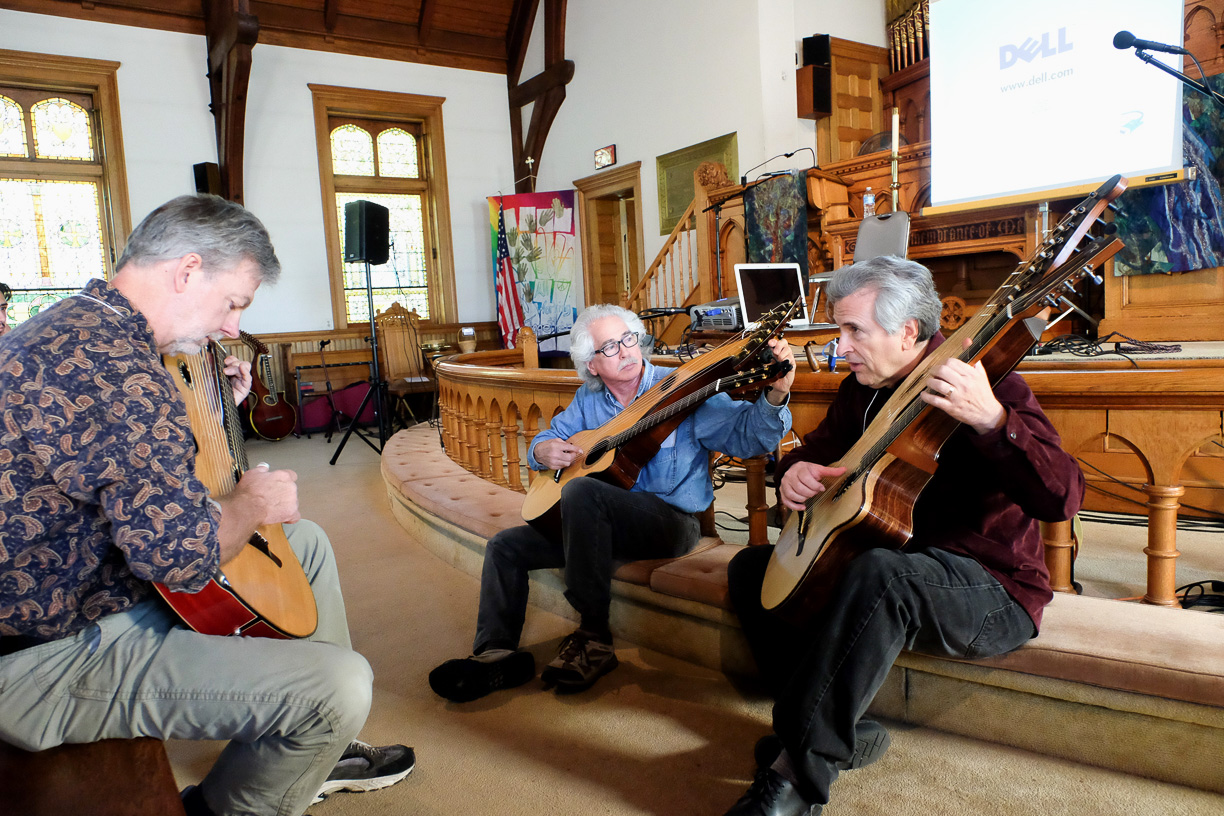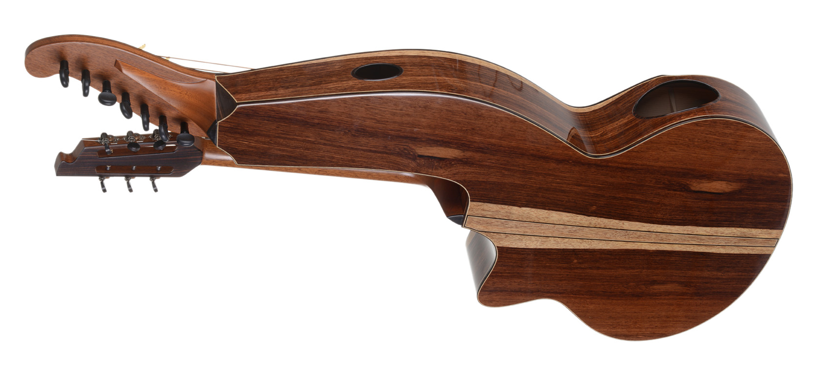 | Those who attended the 14th Harp Guitar Gathering in Connecticut in 2016 were treated to a rare surprise...not one, but two harp guitars built by the inimitable Winnipeg, Manitoba master luthier Allan Beardsell were on the premises! Attendees will remember the story. I had just sold to professional harp guitarist Randall Sprinkle the consigned Beardsell I had listed, when I had the chance to purchase the one on this page. I jumped on it immediately. Here we are comparing them for the audience. We later sat for some quiet time, passing them back and forth, with master Stephen Bennett weighing in as well. Randall and I agreed that they were somewhat different, but neither was "better" than the other. We also agreed they were two of the best sounding harp guitars on the planet. True. Randall already owned a fabulous Tony Karol, and later bought from me the stunning Lance McCollum harp guitar which he had premier luthier Kathy Wingert convert to six sub-basses. And he bought a Duane Noble for this son. That is good harp guitar company indeed! He plays all three, but the Beardsell immediately became his go-to instrument. It has a narrower nut width than my Merrill and Dyer, so not quite as comfortable for my personal technique. Thus I had no qualms about installing it for 7 months in our Carlsbad harp guitar exhibit, where it was a fitting contribution to the modern harp guitar story. It's back home, and - treasure though it is - it needs to be played, and I simply don't have the time to do it justice (nor the space to store it). I consider it all but priceless, as it is the first harp guitar commission Alan received and sold (to 2011 Gathering attendee Esau Simmons. Randall's was actually the first one completed, the prototype to get Esau's perfectly engineered.). I'll repeat here my introduction and assessment that I wrote for the Beardsell prototype harp guitar, as all of it applies equally to this one. If anything, this one is more stunning. One of the (many) perks of this part-time job of mine is that I’ve been privileged to have seen (and heard or played) more harp guitars than probably anyone on the planet. When it comes to new instruments – and new designs – few have made an impression on me quite like the very first Beardsell harp guitar I finally saw in 2011 at the 9th Harp Guitar Gathering®. Distinctive, modern, imaginative, cohesive, daring, beautiful, fascinating, visionary and many other words came to mind (and still do). One word? Simply: cool. And it sounds incredible. Is it for everyone? Probably not for those stuck on the Knutsen or Dyer (or Hedges) paradigm, and not for those looking strictly for pure Dyer tone, as this tends to out-power even a Dyer. Frankly, I think it may be one of the most phenomenal-sounding harp guitars made today. Allan’s tone is, well, hard to describe. Look inside and you’ll perhaps see why – it’s like an Erector Set in there! All this engineering bravado can be seen through the larger of the two side ports (one on the second floor and one in the basement). Uniquely braced on top and back, the several additional struts/tension rods presumably allow the top to be more responsive, and is it ever! In this regard it reminds me of Luke Brunner’s latest Outdoor harp guitars or perhaps that new Reverse Tension harp guitar prototype I played at HGG13. Comparisons aside, Allan’s sound is his own and best of all, with his unique and, dare I say, aggressive, side ports, the player literally bathes in tone. Out front through the “standard” two