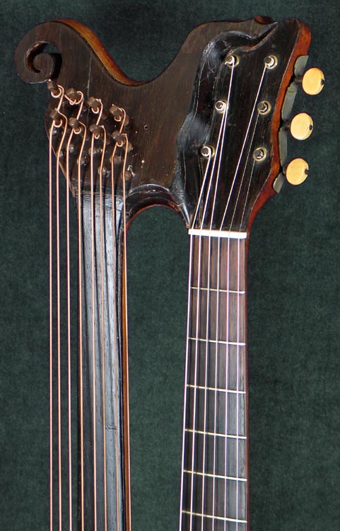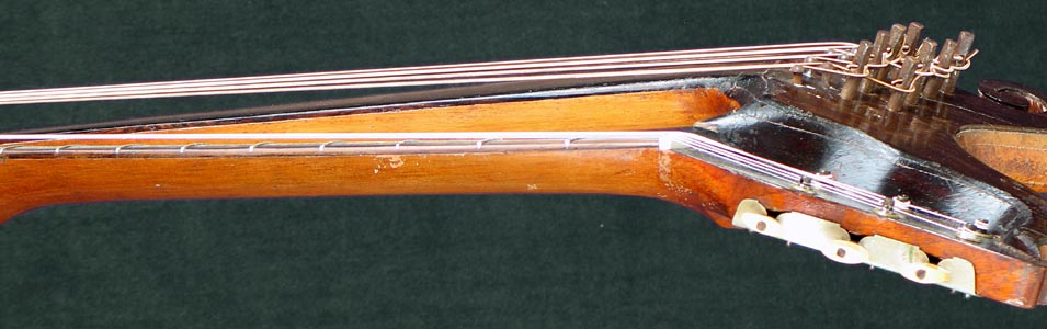 Perhaps part of the secret is in the bridge. This is ultra-cool. It's Bohmann's first design (not the later patented one, but some similar ideas). The bridge is screwed into the top and bridge plate by 28 tiny screws. Each string gets a pair of these - one to hold the string down (under the lip of the head), the other to act as the saddle (over the slot in the head). These are original and imperfect, but do the job extremely well. You can set the action individually for each string by raising or lowering its "saddle screw"! Currently the action is medium and a little uncomfortable, but there is almost an 1/8" of room to lower. My next step would be to use new screws with the head slot filed at an angle so that a single half turn would intonate each string to an 1/8" longer or shorter. Note the slots on the bottom - these could presumably fit tied knots or ball-end strings, but if one looks closely at a similar guitar with the exact same bridge played by Joseph Bohmann himself - circa 1895 - there are ball end strings on it! One can also see a nearly identical, presumably steel-strung instrument in this mid-1890s photo. The neck is narrower at the nut (1-13/16") and wider at the end (2-1/8" at the 12th fret) - much more so than a standard, more parallel neck, and the fingerboard has a substantial radius. Combined with the (currently med) action, it is not as easy for me to play as others such as the Dyer. It is also virtually impossible to see your left hand as you play, so if you "need to look," you may have trouble! I have no idea why Bohmann did this - perhaps it was his first attempt to make a harp guitar - by slapping a second neck on one of his 6-strings. But the join requires the bass neck to be pitched substantially forward (as seen in the 2 profile views). He made at least three of this design (plus many others designs), so it was indeed deliberate. In fact, this harp guitar is the only Bohmann with the main neck centered – the otherwise similar known specimens have both necks centered over the soundhole, so perhaps mine was a “first experiment” (the other two also have a more developed sub-bass nut, rather than the simple Knutsen-like screw posts on this one). No one seems to knows this (or care), but Bohmann may have been the first instrument builder in America (or possibly the world?) to do sunburst finishes on guitars - perhaps 20 years before Gibson. This one doesn't have sunburst, but has a finish unique to Bohmann that darkened with age. It was quite cloudy and worn when found. With the outer veneer layer filled with micro-cracks, we made the decision not to strip it, or re-blend it, but to clean and polish it as best as possible. This shows the wood and color much better, though it also highlights the minute cracking. Restoration was performed by Pat Quinn at Blue Guitar in San Diego, with guidance by expert Yuris Zeltins. The guitar is surprisingly all-original, with an imperfect earlier repair on the back of the bass headstock. Only one piece of rosewood veneer was missing off the scroll. The couple of top cracks were repaired (splinted below the bridge) and the top finish re-blended. Then re-fretted and new nut installed. The "scooped-out" back of the bass headstock is original (two identical necks have been seen), and was carved to allow access to the tuners. Another interesting accommodation is a lip carved out of the joining section to allow the low neck string to clear! More information and full pre-restoration photos can be seen on the Harpguitars.net Bohmann page. All in all, a very interesting (and functional and musical) instrument. Please don't buy it - I won't be able to stand to see it go... - Gregg Miner, the "harp guitar pope" |