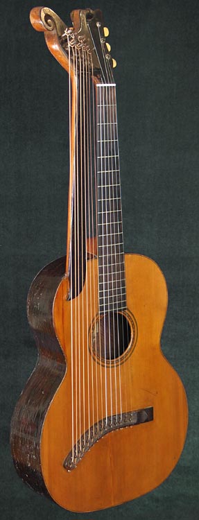 This is one of those historically important (more than you can imagine), incredibly rare harp guitars (especially in this shape) that I would value at 10 grand plus - but for which there is so little appreciation and market that it simply can't demand half that. And so it is a bargain. This is one I had fully restored to play and keep for the Miner Museum. I would still keep it, if only to use for demonstrating the true intent of the early American harp guitar: loud and resonant. Bohmann was one of the first American builders to begin using steel strings (or some sort of silk & steel composite) in the very early 1890s. How they must have blown away the 99% gut-strung guitars! This one is indeed a cannon – loud and full-bodied. Not as pretty as a Dyer or Knutsen, but major tone nonetheless. But the "secret sauce" is the inherent sympathetic vibration. You've all heard about it - harp guitars have all this extra resonance from the open bass strings vibrating in sympathy. In truth, some have a mild amount, and some have a nice healthy dose (like the Dyers), and this...well, I've got to find time to record a little sound clip, because you just cannot believe it. Like playing a small bodied Martin steel-string through a Fender Twin Reverb. I don't know how Bohmann did it. The top is fairly thick (roughly an 1/8"), with light X-bracing (triple-X, with offshoots below and to either side of the main X), only 14-1/2" wide, with laminated rosewood back and sides (Bohmann expert Bruce Hammond says likely 3-ply). But: when you damp all the strings while playing the high E string, it is decent, dry and clean (as many guitars achieve as their limit). When you let the lower neck strings resonate whilst playing the high E, you will hear quite a bit of ambient reverb (and I only have light silk and steels on at the moment). When you let the subs resonate (currently strung with very light phosphor bronze), the reverb is tripled. If you strum a loud chord and stop it, you will hear the aforementioned Fender Twin - it is a mind-blower! I have the 8 subs (a goodly amount) tuned to "Taraffo tuning" - D descending chromatically to G. Thus with every bar chord you play moving chromatically up the neck, you get similar reverb. More below > |