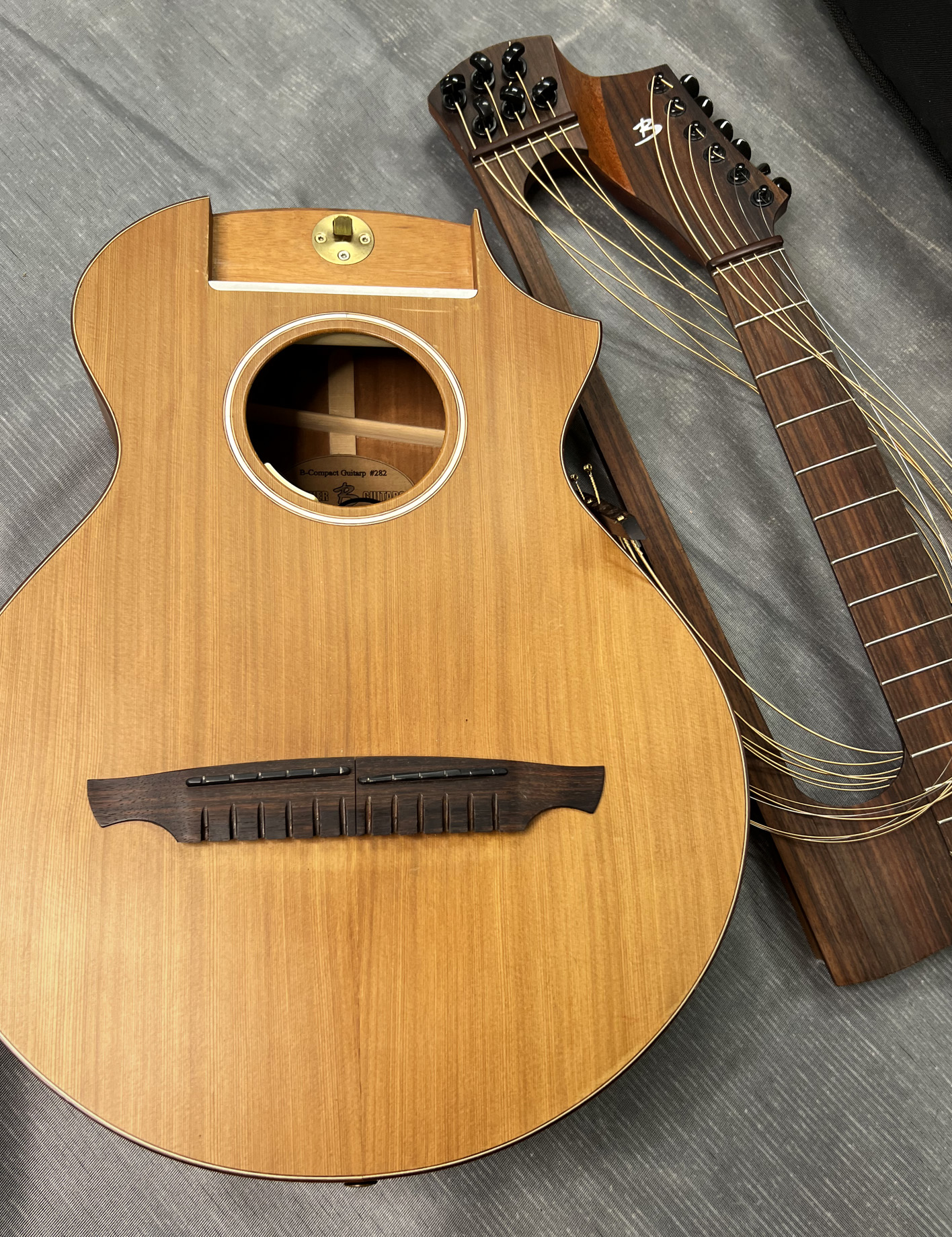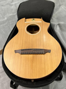 In 2009, I sold the first Brunner "Outdoor" or Travel Harp Guitar in the United States. Along with the very first instrument commissioned by harp guitarist Philippe Fouquet, I had taken the chance and commissioned two of my own. I lucked out, as they sounded simply amazing. Especially for the small compact size. Yes, as seen below, these come apart for the airline's overhead compartment! According to the consignor (not the original owner), this beautiful instrument is in "Very Good +" condition. The label states 2014, but the original owner says they bought it new around 2020. Regardless, if you go today to the Brunner Guitars web site and run this model through their pricing system, you'll see that it comes to about $6600...if you pick up in Switzerland. So, anytime I can find and offer one in the States, I'm all over it. Just as I reviewed the original models in 2009, if you can live without the visual of a hollow arm, then get one of these, as they truly sound incredible. The current consignor (a repeat customer of mine) has multiple high-end harp guitars and agrees with me, saying, "it's miles ahead of Timberline, Tonedevil and Emerald." Seriously. The bass side port might even fool you into thinking you're playing a Holloway/Worland Dyer. And if you're not thrilled with the sound, then returning it won't be a huge issue due to its compact size. (Spoiler alert: Of the several hundred instruments I've sold since 2006, I've had exactly one return). So, yeah, I think you'll love it. Yes, it has electronics (tested), and you can plug it in and blow people off the stage, but the point of the instrument - besides the incredible bullet-proof disassembly and reassembly - is that they are wonderful acoustic instruments. You don't have to plug it in like an Emerald to feel and hear the sub-basses. This is a consignment listing that will be shipped from North Carolina. My full 3-day approval period applies (returnable at your expense). I urge you to also read both my original listing on the first models (though this one is much better) and also the fascinating story behind them. - Gregg (Sir Gregory) Miner |