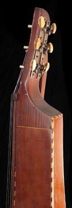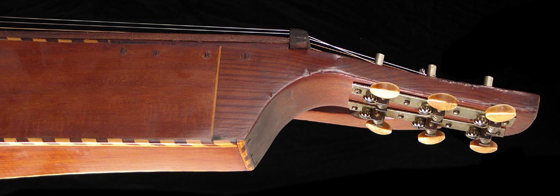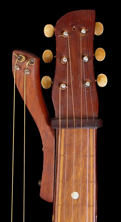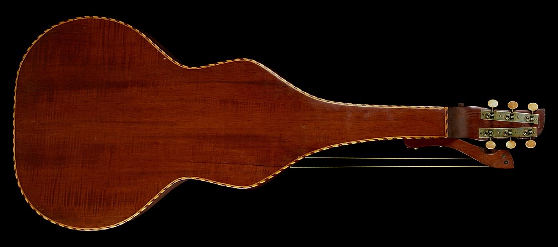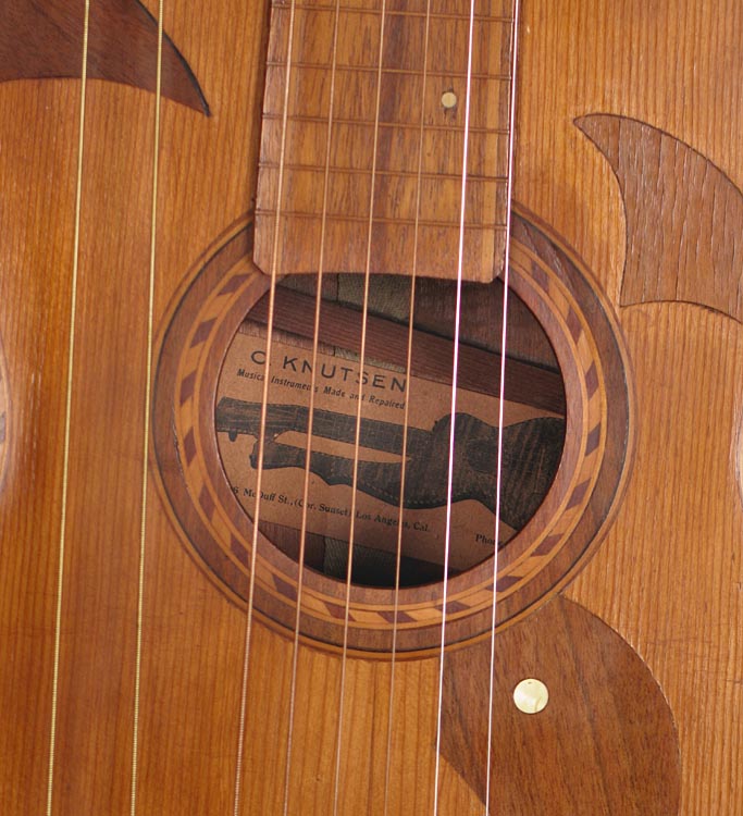 | Now this is my cup o' tea! I have a soft spot for these beasts (as you might have picked up on) and have been hoping to offer one ever since opening Harp Guitar Music for business. I have my ear to the ground for these, so know just how infrequently they are ever offered for sale. Those who follow the Knutsen Archives know that this one has had a more circuitous path than most. Originally, two different alleged owners sent in rather poor photos (partial glimpses so poor and random that I catalogued it as two different specimens!). One of these owners then sold or traded it to Gruhn Guitars. They apparently all but gave it away, as George offered it to me at about half price in a group of harp guitars that he wasn't moving. Concurrently (he was fishing apparently) he offered it to my friend, Weissenborn researcher Ben Elder. Rather than get in a bidding war, I let Ben have it (though he ended up paying a grand more than my original offer). It promptly went into the Steel Guitar Exhibit at the Museum of Making Music, from whence it has just returned. Ben has another, so decided to offer it before he became too attached it. You do not want to give him a chance to change his mind! So that's what's known of its owner provenance of the last few years. Now what about its original life? Well, we know it was built in the last three years of Chris' life (1927-1930) as it has the McDuff Street label. This label is large, still intact and in fabulous condition - surprising when you realize how much work has been done on this instrument! Heavy restoration? No - almost none! No, the work was to modify this instrument from a standard 12-course harp steel guitar with two subs and four trebles to a harp steel with the trebles on the bass side, and then even further! Currently it has no trebles, but this can very easily be remedied as I'll explain below. But first, you should read the entire original explanation that I just updated on the Knutsen Archives, specimen number HHW22. Ben and I thoroughly sleuthed this out, and I believe we have the history pretty accurate. (Note: "HHW' is my code for this model, "22" means it is the 22nd specimen of this model inventoried. There are no Knutsen model designations, nor style or serial numbers) OK, clear as mud? As I explain in the Archives, Knutsen may have done some of these modifications for a customer himself; he certainly did so on a similar "multiple reconstructive surgery" specimen here. Regardless, at this point it should be a fairly simple matter to re-drill four zither pin tuner holes in the upper right bout inlay piece (with care, they can be installed in the exact original location) and this will look essentially like an unaltered fancy Knutsen harp steel. Truth be told, Knutsen aficionados don't consider this a detriment in any way, we actually consider it of value. This is what gives Knutsen so much charm and character. No two Knutsens are quite alike, and when we find something that clearly has some additional personal story behind it like this one, we relish it. Still, because of these funky alterations we're listing it at a very attractive price. In my opinion, it's infinitely more interesting than a Weissenborn. Unlike those much more common and uniform instruments, this is truly one-of-a-kind, one of only 28-30 known (not all have been added to the Archives yet), and similarly fancy with its rope bound top and back. The back itself is a beautiful piece of wood - like so many of Knutsen's instruments, difficult to identify.