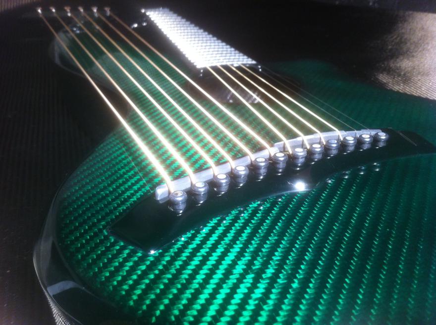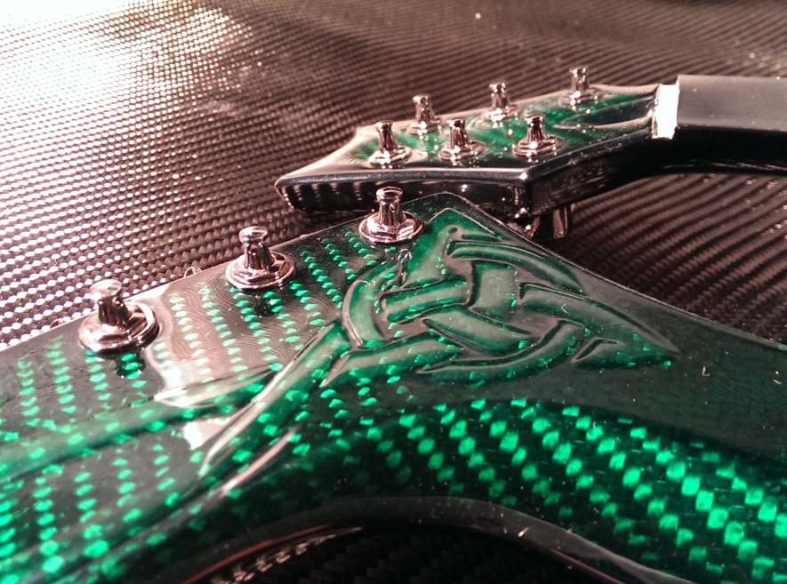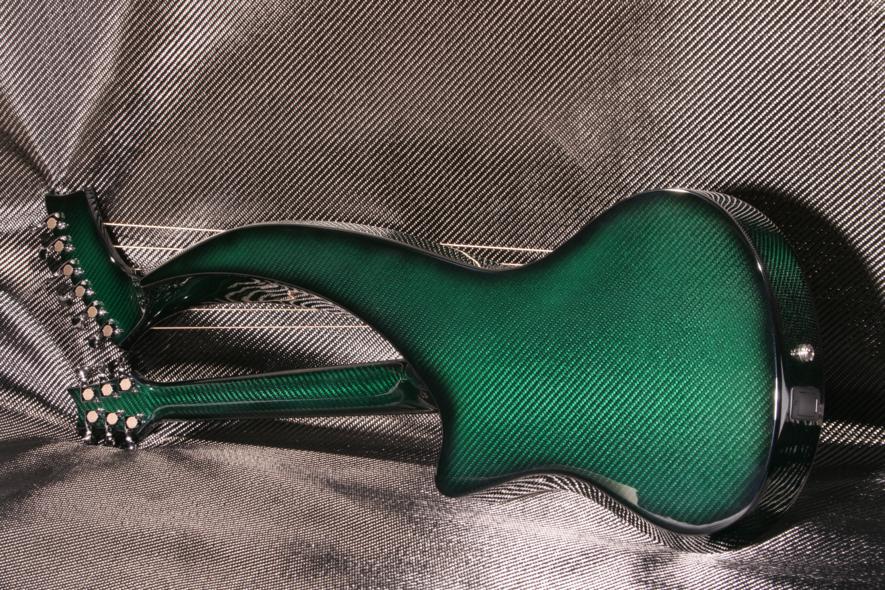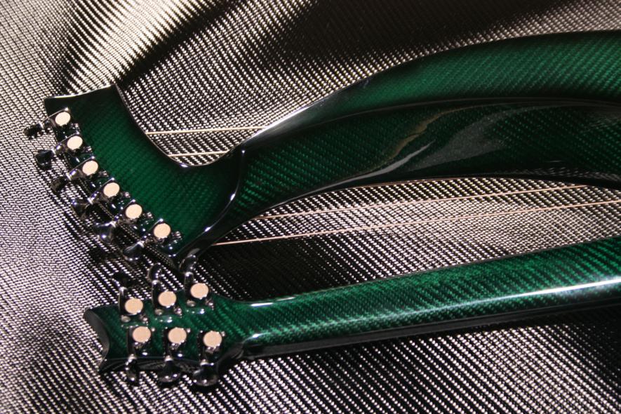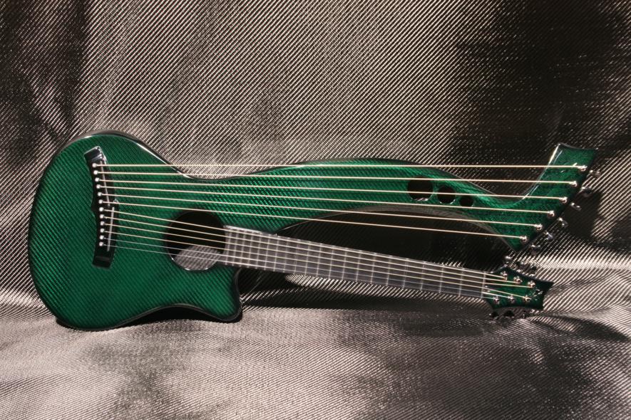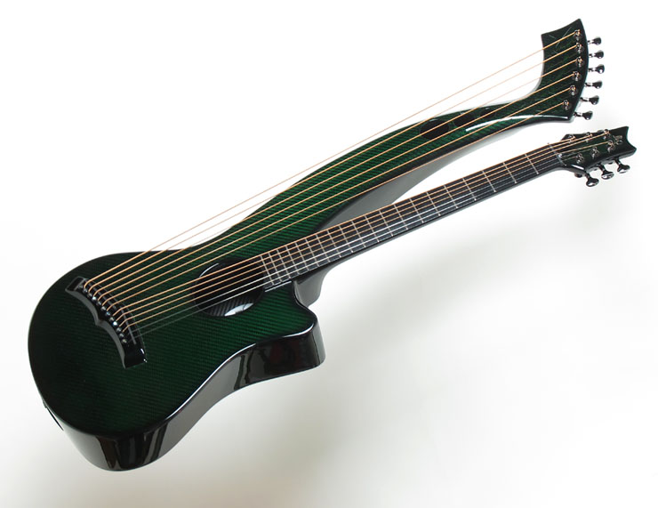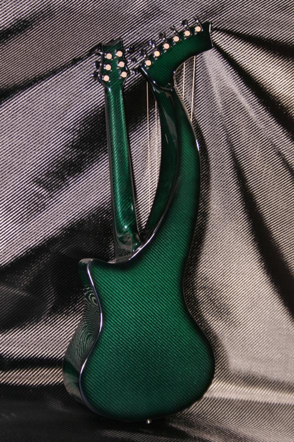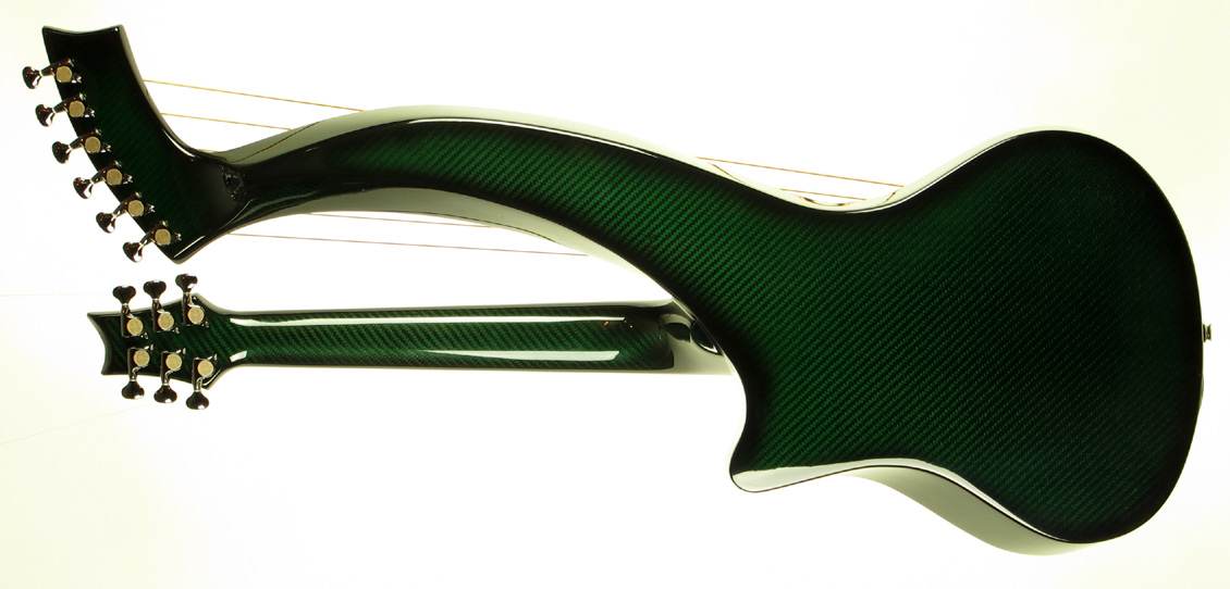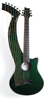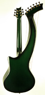 | For those of you who haven’t yet heard about this amazing creation, check out my blog from last May and also my report of its debut at the 11th Harp Guitar Gathering last fall. The carbon fiber Synergy harp guitar is the brainchild of Alistair Hay of Emerald Guitars in Ireland (though I am officially claiming partial credit for goading him into it!). After three years of pondering it, he decided to jump into the project just over a year ago. Having received a serious request and commitment from one of our Gathering participants, Michael Belotto, Alistair decided to incorporate Michael’s specific requests into the first harp guitar prototype. Notably, this would be a small instrument with a shorter scale length. It also looks really cool. The first one I received for this U.S.A. listing is actually secondhand. The owner decided to trade it in for a custom 7-bass instrument. You can see the former owner playing this very instrument here. It is “near mint,” having light finish scratches here and there as its only flaw. For that, we’ve knocked $550 off the price, so this is a great deal on this particular model, which normally retails at $3050. This is Emerald Guitar’s “Artisan series” model with an upgrade of the Celtic knot, which goes nicely with the dark green color. If you want to know how all this is accomplished, don’t ask me...how these things are made still remains mostly a mystery to me – Alistair’s been working with this stuff for ages and apparently knows all the tricks (and has invented many). |   | |