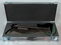 As I was infamously quoted after my first time playing one at the Harp Guitar Gathering, “It actually works.” (Alistair wanted to put that on the T-shirt, I think). This was of course simply alluding to my naiveté about carbon fiber guitars in general, as I’ve personally had no need to explore them so have little experience. True, it doesn’t quite sound like wood, but it does of course sound like a “real” instrument, and a quite good one (and I bet it would fool some in a blind test). The balance of the neck across all strings and frets is exemplary, and only suffers acoustically in a live environment by being quieter than, say, a full-size Dyer (which is not an unexpected tradeoff, I imagine). The subs are similarly quieter, and while they cover the range all the way down to a low F (supplied bass strings are a custom Newtone set for standard tuning FGABCD), they don’t project or boom like the better full-size harp guitars (You can actually see and hear a great acoustic clip of this very instrument by its original owner, the talented Jon Pickard, here). However, plugged in, the Synergy harp guitar can compete with the best (amplified) instruments, and you can presumably crank it to 11 (or feedback threshold). This one comes with a stereo B-Band system (the battery under a handy flip-out opening near the end pin, with the subs and neck fully separated for balancing and EQ-ing each section separately. It sounds glorious through my Behringer guitar amp. A sturdy flight case is included (optional gig bags are coming soon), which measures just 40" x 17" x 7-1/4" (shown at right in front of my Dyer in its gig bag). It consists of aluminum frame with laminated plywood sheeting, with foam insert. Case and harp guitar weigh about 27-28 pounds total. You’ll definitely be the first on your block if you snag this eye-catching beauty. Operators standing by. - – Gregg (Sir Gregory) Miner | ||