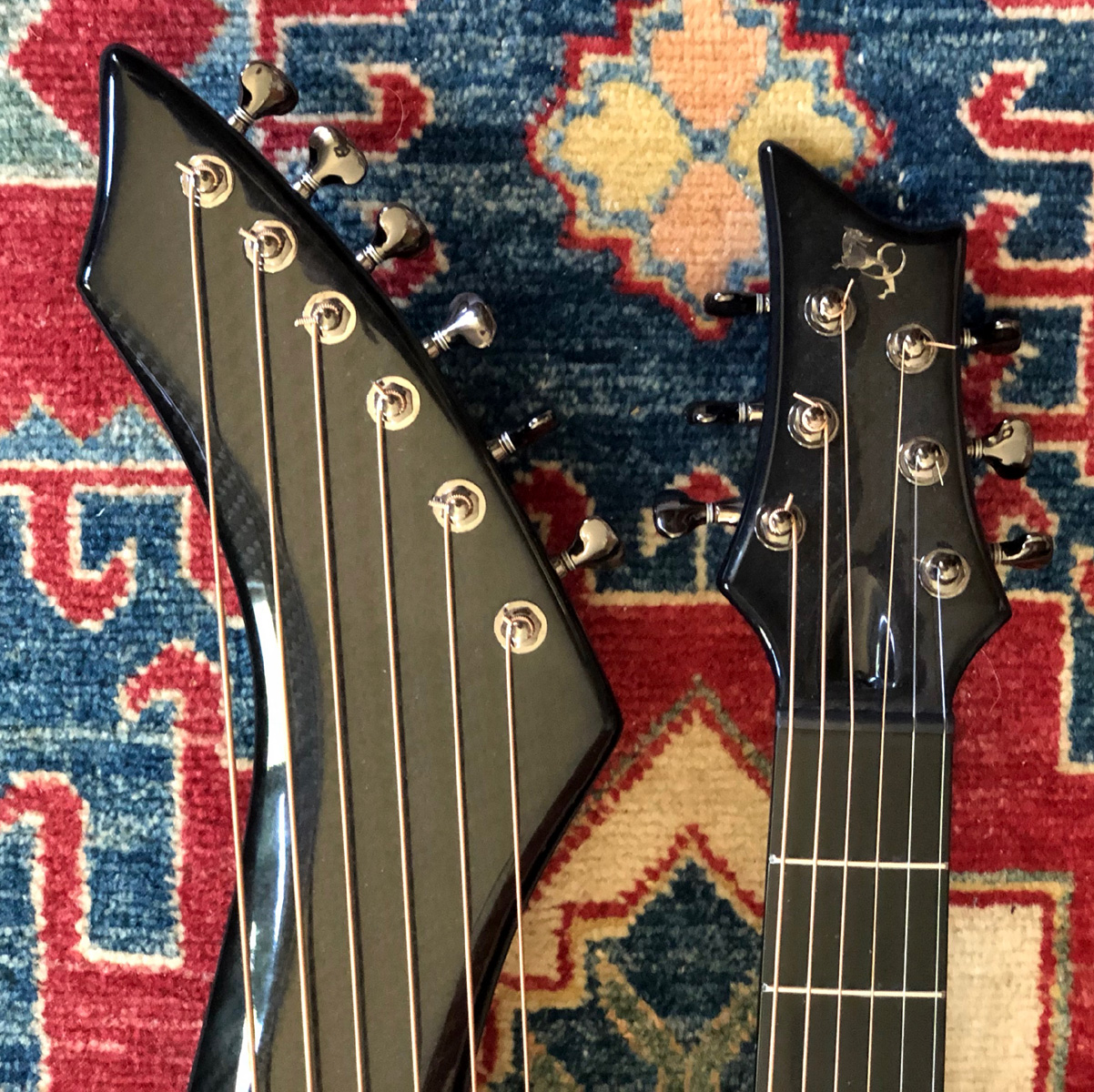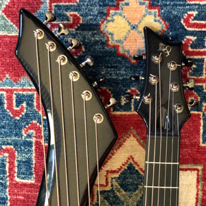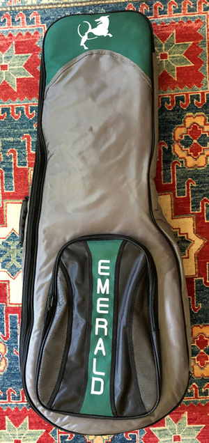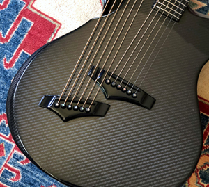 that's an easy trade for the savings. It comes with Emerald's standard-install LR Baggs pickup system and gig bag, and is standard in all ways except one: it has a custom neck (currently a $450 upgrade) with a nut width of 1-7/8". That's equivalent to a Dyer harp guitar. So if you've been hoping for a carbon fiber Emerald with both a wider neck and at a huge discount, this is your chance! These are photos of the actual instrument. Please note that the anomalies in the top picture are reflections only (see photo at right). These things are notoriously difficult to photograph! It will ship directly from the seller in the Pacific Northwest. Sorry, continental U.S. shipments only. This one will go fast! - Gregg "Sir Gregory" Miner | ||