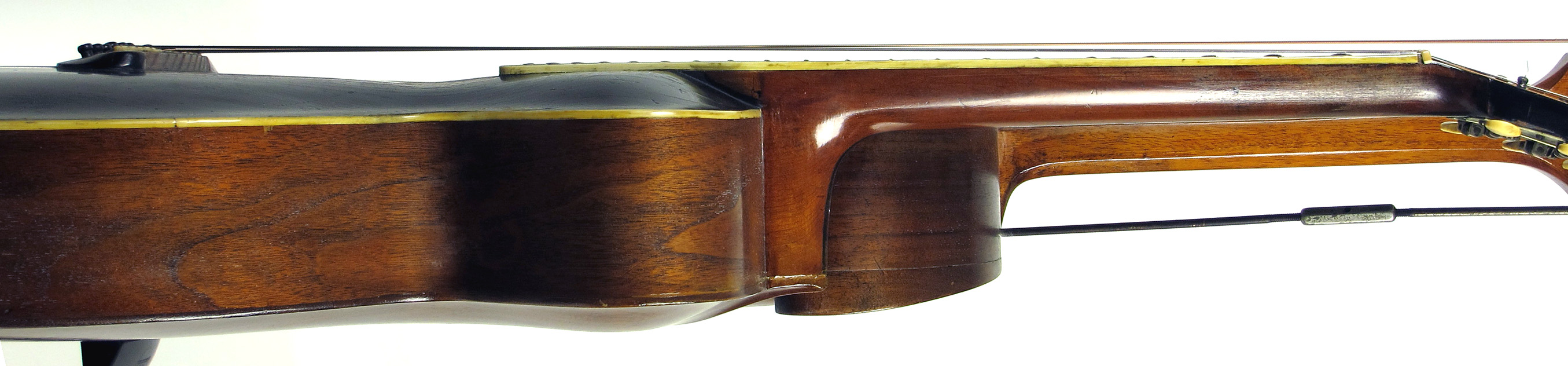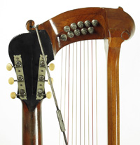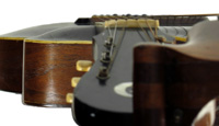 Ah, I have enjoyed this one! At the very top of the list of harp guitars that even six-string players want to own – if only to hang on their wall – is the Gibson harp guitar. And, condition issues aside, what's even more impressive than the commonly seen c.1908-1920's floating bridge Style U is the much less common scroll bridge model. The best part being the size – 21 inches wide! Massive fully-hand-carved expanses of top and back wood do not hurt either...the carved back is from a solid chunk of wood, for cryin' out loud! (either walnut or mahogany, no one is 100% positive!) The fixed "scroll" mahogany bridge also gives these models a somewhat better sound, while giving the instrument – along with the engraved metal strap bridge support - that old turn-of-the-previous-century other-worldly vibe. It is simply a stunning collectible that pretty much anyone into plucked stringed instruments is blown away by when seeing for the first – or thousandth – time. Why am I getting rid of it, you ask? Simple - after over 20 years, I was able to upgrade, as you'll see soon in an upcoming blog. Why so inexpensive? Because it's got a replaced side. The rest of it: high action, poor intonation, old repairs and condition are all par for the course. In fact, all in all, this is actually one of the better condition Gibson HGs from this era I've seen. The action is ~3/16" to 1/4" at the 12th fret, and doesn't intonate well there, but I'd challenge you to find one of these in original condition that's any better. Yes, the neck is like playing a baseball bat with frets. Quite frankly, it is a "labor of love" to play – as in "not very fun" to "painful." But I'm a wimp who plays sporadically; you'll do better! As my fans know, I've used it twice on recordings: the first time on my "Charlie Brown Christmas" medley for A Christmas Collection, and more recently, for one of Brad Hoyt's tunes ("To Last a Lifetime," with a similar Vince Guaraldi vibe) on Together Alone. Listen to those tunes with good speakers or headphones (the CDs, not the lousy MP3 samples) to hear the amazing sub-basses. You know how owners of Dyers and other flat-top harp guitars love to boast that their basses "sound like a grand piano"? They don't. They sound like wonderful oversize low-pitched acoustic guitars. Gibson harp guitars sound like a grand piano. The subs, that is - the neck strings, not so much. It takes experimentation with strings and then arranging and playing adjustments to get them to balance with the subs (more so for fingerstyle). For usable intonation, I did my common trick of putting a second saddle behind the other saddle (in this case, removed and replaced with short temporary "backstop"), with the string contact point as close as possible to the bridge pins. I'm certainly not going to move that bridge; nor would a neck reset be easy. Had this been my main instrument, I would have put on a new slightly-wedged fingerboard (it could use a planing and re-fretting as it is). That's entirely up to you. Meanwhile, just stick with first position if you like. Now about that side. Someone had replaced the bass side (tail pin to bass support) with a serviceable piece of mahogany. It kind of matches as the wood on the other side looks somewhat like mahogany, even though we think it's walnut (jury of experts still out). It had been bent badly at the tight waist and showed some splitting, so Kerry Char put fiberglass filler there, staining it somehow to blend it all in. Since you can't see both sides at once, it never bothered me too much. I don't think he did much else to it, other than touch up the top scratches and finish wear (you might even want to touch them up further). The two tiny pieces of fb inlay could be easily replaced. The headplate isn't perfect, but this is one of the extremely few old Gibsons I've ever seen with the classic Orville crescent & star logo. I just had to have that! (and will dearly miss it). The back of the head - which looks like it cracked down the middle at one time - looks re-painted and there's a bit of wood filler(?) at seam to bass head. Other older repairs include a long splice of wood in the center of the back tapering from almost 1/4" wide at the tail to a sliver a ways up. It almost looks like a center seam except for that last couple inches. There a few other short and long back cracks that are decently repaired, and there's a tightly repaired crack in the top at the bass side waist. The top is otherwise very sturdy and undamaged structurally. A tiny piece of ivoroid was replaced on the bass side. There are typical fingernail dents at first position from a lot of playing at one time. This transitional model (there a lot of transitional Gibson specimens) has the ten subs that Gibson settled on pretty quickly, with the tuning that starts above the neck's low E string with G# and ends at a low A#/Bb (note that sub-bass tuning wrench is not supplied). In 2009, I cleverly put together a set of DR coated steel strings with certain gauges in red to emulate the ingenious original copper wrap/silver wrap color coded set that Gibson offered. I used this instrument for the proof of the concept (which worked quite well!). It can be re-strung with full steel, silk & steel, or even full nylon/gut, a heavy set of which Gibson always recommended for these early instruments. But no matter how you string or play it, it can never be less than the most imposing instrument in your home! –