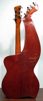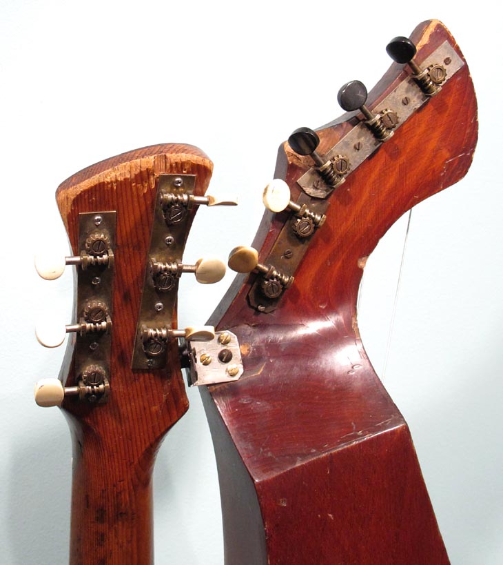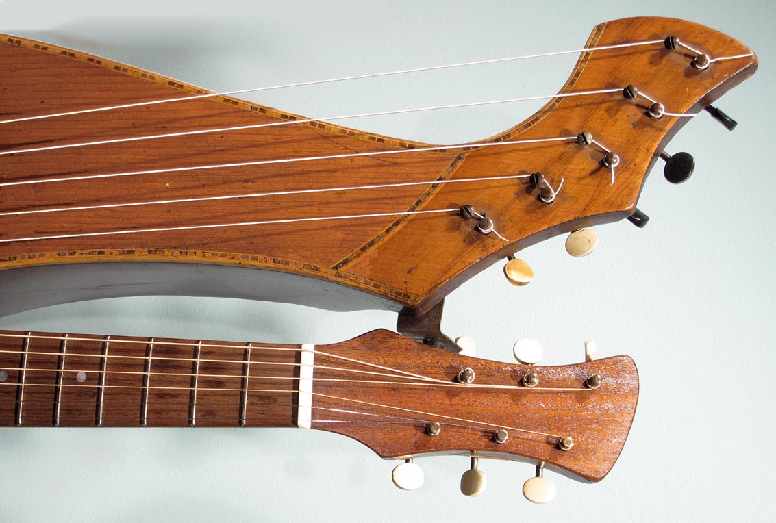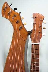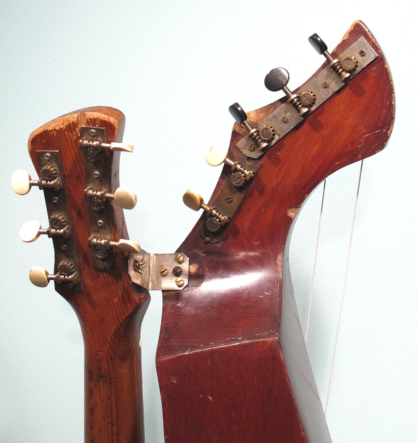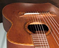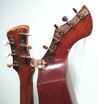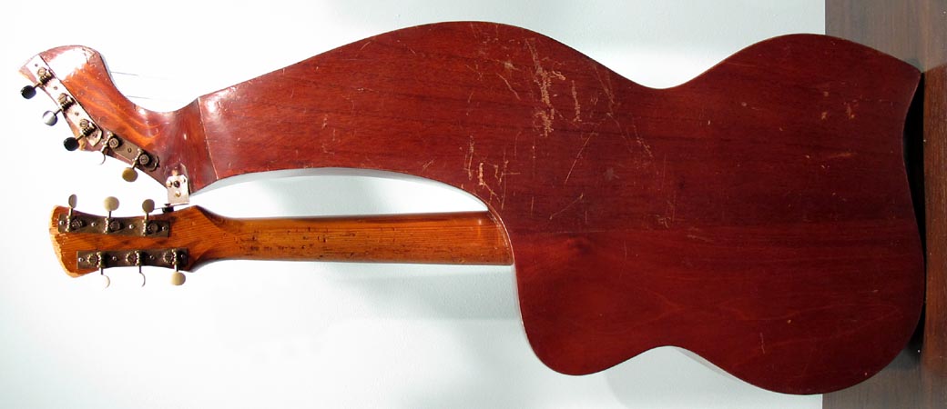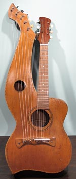 I always have a lot of interest in smaller harp guitars, specifically those with shorter scales. This one is pretty idiot-proof, as it was fully restored by Knutsen guru Kerry Char. Knutsen's usual "short scale" instruments (he was a prolific builder of this variation) are normally "true 3/4 scale" - meaning 19-3/8" in this case. The neck width is also slightly narrower to match. How to you tune such an instrument? Well, we've had conversations about this for years. The consensus is that these were designed for women, children, or anyone with smaller hands. And as such, they still retained standard pitch. Using the same strings as for a full size guitar simply means that the strings are more slack. In that case, we imagine that some 1900's players may have tuned them to relative pitch, as the strings would allow, perhaps to suit their vocal range, for instance. This same short string length enables one to use it as a terz harp guitar if they wish (tuned up a minor third) - that's what I did with mine. Currently, this is tuned to standard pitch, strung with medium strings, which still feel plenty light. One minor drawback is that you need a softer touch with a neck like this - you don't want to grip the neck overly hard, which can cause intonation problems in open chords (I'm giving you this heads up, because I myself tend to be heavy-handed). There are also some finger wear depressions in the original fingerboard. Condition: Though this has obvious wear from age and extensive playing - including severe "washboard effect") under the soundhole from pick wear, I still give it high marks. It's essentially all-original, with no unsightly repairs, so appearance is "antique" and consistent. The only inconsistencies are where the headstock was re-French polished, the new frets, and new bone nut and saddle. These were of course necessary to turn it into a true player's instrument. And play it does! Intonation is flawless, thanks to Kerry's re-working of the bridge (the holes are filled, and new ones re-drilled a little lower, so a larger, compensated saddle can be installed; you can just see where the original fretwire saddle was above). Neck is straight and angle is perfect - this can be adjusted by the L-bracket (note the new extra spacer in there so everything now aligns again perfectly). Tone is a bit more unique - these smaller instruments don't sound as rich and robust as a full size Knutsen, nor do they sing like a Dyer. Perhaps a bit more "compressed" with more fundamental. Still, plenty loud and balanced across the entire range. Right now, classical nylon strings are on the subs (and sound great), but do not at all match the neck's steel strings. For all I know, this could sound great strung completely in classical nylon or gut. For my own instrument, I found silk & bronze (with S&B basses to match) made it sound the sweetest. In essence, you may want to experiment with tunings and strings, because this is one versatile instrument. Other repairs: Essentially no work was needed or done on the body. Inside, only the bridge plate was replaced - to conform a little more to "reality." Bottom line: Many ask about these vintage small Knutsens to use as a "modern professional harp guitar." The answer is "not quite" - there are simply obvious differences in brand new instruments and old Knutsens. But this one is comfortably close enough, and probably sounds as good or better than a randomly-commissioned new small-size or short-scale instrument. Mainly, it's a playable, usable cool vintage Knutsen! -Gregg Miner, the "harp guitar pope" |