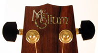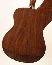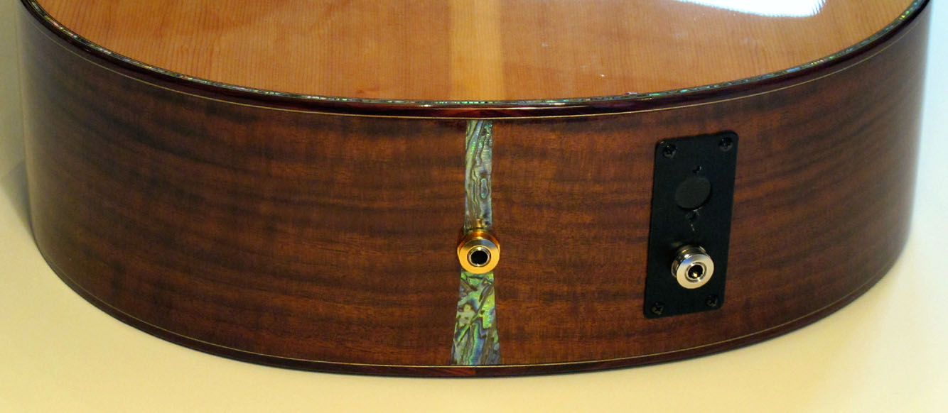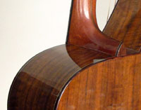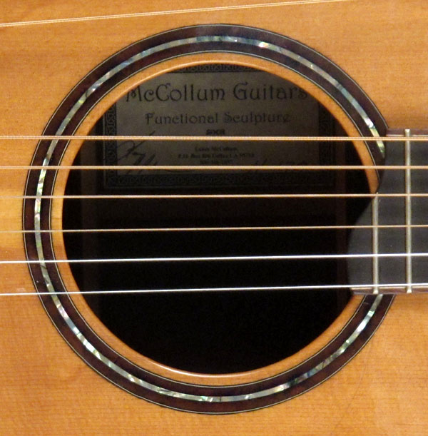 Lance McCollum passed away suddenly in 2009. Having only briefly met him once at Healdsburg, and never having a chance to fully explore his harp guitar production, I am now at a loss on many levels. This instrument, which he built in 2001, is innovative and spectacular. Though the fretboard shows the finger pressure wear of lots of play, the instrument is in near-immaculate condition, with only occasional minor dings and a worn down spot on the arm in the beautiful finish to show that its well-loved pedigree. Though it vaguely resembles a Dyer, its obvious inspiration, it has many noticeable differences: 14 frets to the body, the flat dove-tail heel neck joint, fully separate bridges (with a string bank gap to match - this will either be a boon or a point of confusion to some harp guitarists), an original bass headstock design, well away from the main neck, with matching Grover tuners, a bit more depth than a Dyer (nearly 5"), and of course, that bizarre "corner sound port"! Though it looks a little odd, it is an amazing piece of work, with the binding splitting into two paths as it traverses the strange gap. It also makes a wonderful and natural "speaker" for the player. Cover it up, and the harp guitar sounds amazing - something akin to a warmer, more buttery Duane Noble sound. With the port open, the player enters their own world, a veritable "orgasm of sound" (Too descriptive? Sorry, it's true!). Fit and finish are a solid 10, with a glossy, "eye candy" beauty that similarly reminds me on a Noble HG. I'm guessing the "vintage" colored top is Sitka, and this symmetrical bear claw harp top was a find, indeed. The walnut (I'm guessing Claro?) back and sides are similar prime real estate - notice of course the transitional color and grain in the back. The headplates appear to be rosewood. Fully bound in what looks like rosewood, the top ups the ante with additional abalone. With side dot markers, only the single pearl fretboard inlay is required. Sorry for my headstock inlay photo - this is beautiful, shimmering mother-of-pearl as well, flawlessly executed. Action is good, neck and intonation essentially near perfect (truss rod in there, just in case). The top has normal bellying behind the bridge, and a paper-thin bridge separation here; owners have all said this was like this from day one - you could always have a good luthier check it out. The clear plastic pickguard is mostly invisible. Grover tuners are a nice choice, and work great. I'm not a fan of the side-mounted L.R. Baggs control, but I imagine this helps with stage functionality. Lance always maintained that Michael Hedges was on the cusp of ordering his first modern harp guitar from Lance, and I can easily imagine this being the "dream design" (see Lance's Oct, 2000 forum post about Hedges here). The 5 subs are of course the traditional Hedges number, and perhaps their placement off a ways in a tighter cluster are geared specifically for tunes like Because Its There. The electronics may similarly be geared toward this song - they are outrageous! The main strings appear to have an under-saddle pickup that sounds very natural; this seems to go straight to the main endpin jack with no controls. The 5 subs each have individual Baggs Hex pickups and have a separate jack off center on the body. The Baggs side panel is dedicated to the subs and provide full EQ control: Volume, Low, Mid and Hi, with EQ sweep for the Low and Mid faders. In a word, "overkill" - but if you wanted to crank your subs and perform BIT at, say, Woodstock - this would do it! It comes with a foam-fitted, soft Pro-tec case, but just fits into a Holloway hard case (I can probably get one) or my HGM gig bag (with or without caseXtreme), should you want to upgrade. Frankly, considering the circumstances, I have no idea how to price this one-of-a-kind instrument. The last price for a "basic harp guitar" on the now retired McCollum web site was $9500. I can only imagine the up charge for the appointments on this one: Killer wood, Abalone binding, rosewood headplates, corner soundport, electronics, etc. I'd guess about 15k, wouldn't you? Though well-played (it has had three owners to my knowledge), I'd call it "barely used" - rather, it's perfectly "broken in." It's Sad to say, there will also never be another. If I owned it myself, I'd call it a 20k irreplaceable collectible (with apologies for the circumstances), and not let it go for a penny less. The consignor is being very reasonable with what he needs to get out of it. So in this case, I want to do right by him, honor Lance with the true value of this masterpiece, but also make sure it sells. See price and terms below, and make your decision accordingly. - Gregg Miner, the "harp guitar pope" |