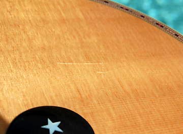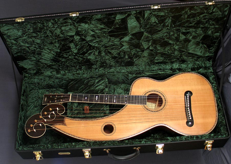 DO NOT BUY THIS HARP GUITAR! Because I want it. Well, actually, I own it. Yes, technically, it's for sale (or my wife will kill me), but the fact of the matter is that I took a chance on this investment, and I'd be an idiot not to hang onto it for as long as possible. Speaking of idiots - everyone passed this up when it was listed on EBay a few weeks ago. I assume that it didn't sell because of the nasty crack it suffered on the inside of the arm from an improperly made Cedar Creek harp guitar case (since repaired). Oh, boo hoo. That's all they're worried about? I find it ironic that an otherwise spectacular instrument goes unsold at a ridiculously fair price - due to a full, honest disclosure - whereas meanwhile, all sorts of thrashed harp guitars with a plethora of visible defects and a whole host of hidden, undisclosed defects sell for too much. Oh, those misguided snipers! Upon contacting the owner about listing it here (he was anxious for a quick sale, so didn't go for it) I learned that it was the very instrument played by Andy Wahlberg on my very own Harp Guitar Dreams CD. Andy vouched for it as well (why he didn't snag it is one of life's great mysteries). I know Merrill instruments well, having heard several, including Stephen Bennett's own (#1), which was long the best sounding harp guitar I had ever heard - until Kathy Wingert topped it (her #2 is SB's new chosen harp guitar). So how could I go wrong? Well, I couldn't. I was hoping it would be decent enough to sell, but I really didn't expect to discover that I might actually want or need to keep it. In person, the repaired damage didn't look as bad as it did in the photos (nor did the two other minor finish blemishes/scratches shown). The repair is rock solid (cleated inside), and once you get over it, you really don't notice it - you never see it while you're playing, and neither does the audience. What everyone sees is what Jim Merrill says is the most beautiful harp guitar he has ever built. I don't doubt it - it is certainly the fanciest (the standard "Stephen Bennett model" is based on his unadorned, unbound Dyer Style 4). All the woods are absolutely top grade, fit and finish are a 10, and he clearly splurged on all materials, including Waverly tuners and special order purfling - a combination of classic vintage and modern ultra-detailing. I especially like the subtle and distinctive white/red/white binding on the sides. The finish (which I assume was deliberate) is a reduced-glare satin spray finish. Plays like a dream (I may lower the action a hair) and sounds like a Merrill, meaning fantastic. Though it sounds a bit "tight" - as it's virtually never been played - it still sounds better than most other instruments. And I suspect that once played in for a year, it'll sound like Stephen Bennett (well, the instrument will - you or I won't). Electronics feature a Pick Up the World stereo under-saddle pickup system, with a Stereo PUTW Pre-amp (plugs into the tail jack). The included case is what Stephen Bennett originally used (he now uses my HGM set) - a wonderful Cedar Creek case that has a larger-than-it-needs-to-be accessories box that the arm wraps around. Supposedly, Cedar Creek made a construction error that caused the mentioned damage and this was fixed. But one should still put extra padding around this area. If one wishes to lighten their load, I will happily substitute my HGM gig bag/flight case combo, and re-offer the case by itself. Some perspective: Jim told the previous owner that if ordered today this guitar would be over $10,000. Add to that an $800+ Cedar Creek case and a few hundred for the pro Pick Up the World system, and what we have is a killer package worth over $11,000 - if "as new." For the damage compensation, I've taken off a full 25% - which may or may not be fair - it's a tricky call, I know. But frankly, I'm here looking at and playing this thing...and I'd be an idiot to let it go for less. I'll repeat - please don't even think of buying this! (but don't tell my wife I said so) -Gregg Miner, the "harp guitar pope" |