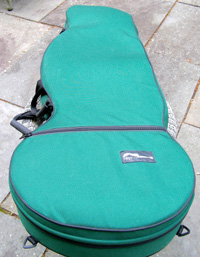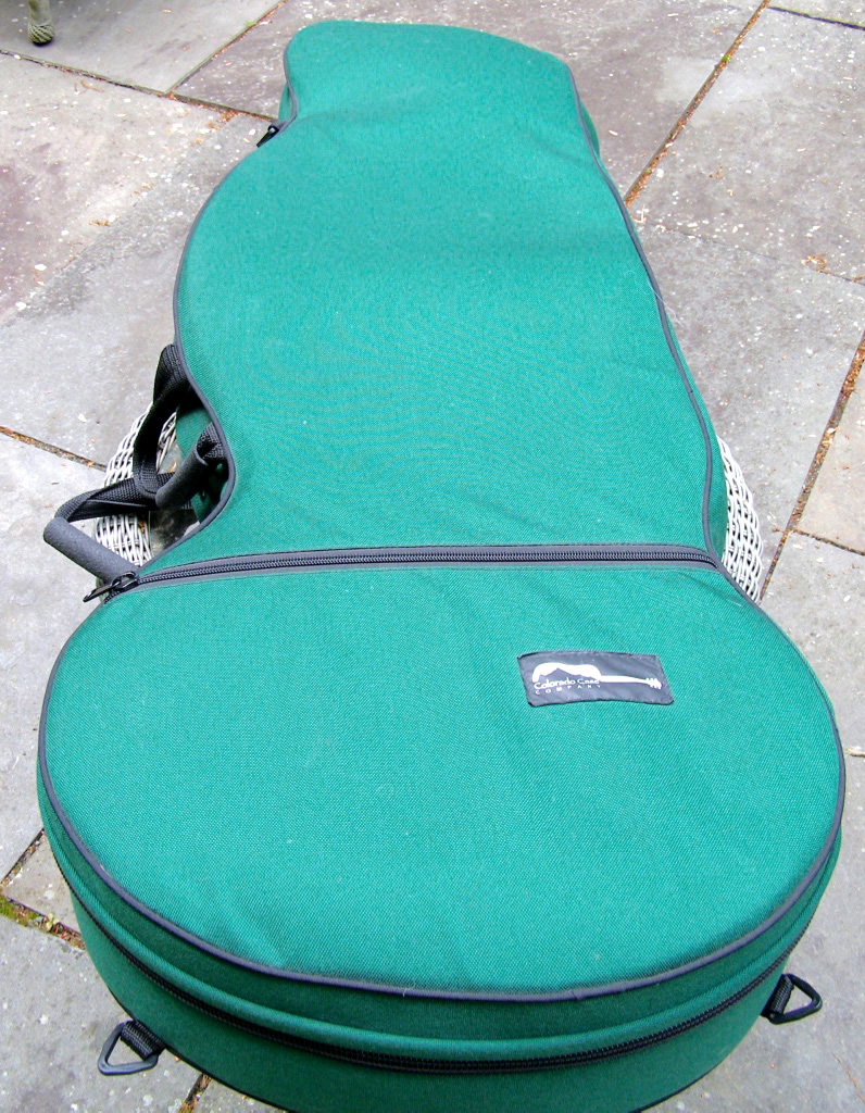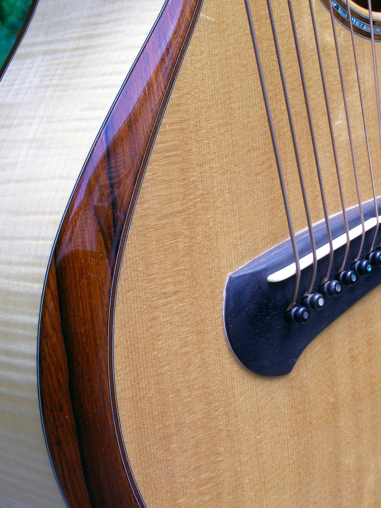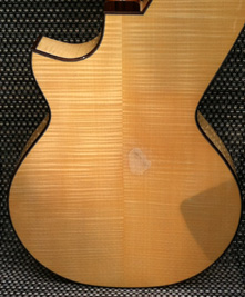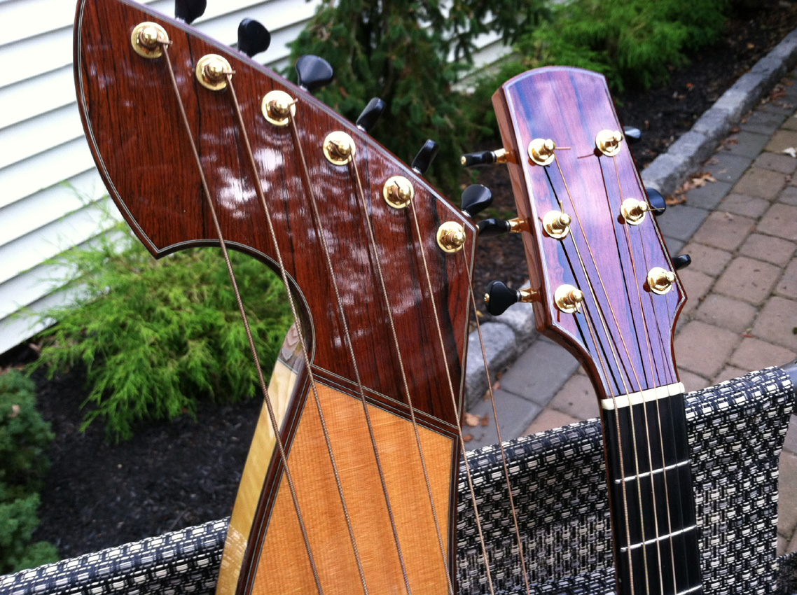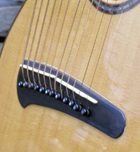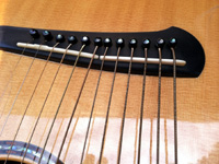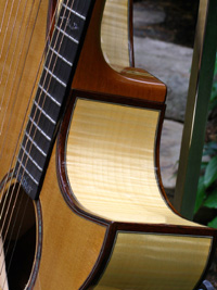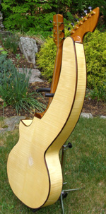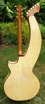 | Another beautiful Duane Noble creation! This one was built in 2008 for a woman who used it in her Renaissance Fair performances. It is inlaid with abalone at the end of the fretboard with her "stage name" Leather. Her costume belt buckle scratched up the back a bit and wore off a spot of finish a bit under 2" in size. The bridge separated (possibly from higher alternate tunings) on the bass side just the height of a sheet of paper, and she had it repaired by luthier Mark Simon in NJ (using hide glue). She says the soundboard is flat and action is great. Other than additional finish scratches around the back defect, it is in fine original shape. I have not had the pleasure of playing or listening to this instrument, but of course have sampled and/or sold many of Duane's instruments...he's one of my favorite harp guitar builders! The owner says "the tone is amazing and magnificent" which I would normally take with a grain of salt, as most every harp guitar owner says that about their instruments - but in this case, it's undoubtedly true, as that is generally a given with Duane's instruments. It's just a matter of whether the maple back and sides and Sitka is to your liking. Her photographs show the typical gorgeous detail and fit and finish of a Noble instrument. The highlights on the top are camera glare. Extras include a heavy duty Colorado Case gig bag (my Harp Guitar Music design) and a K&K sound system. Specifically, "a K&K Sound dual pickup system with 3 transducers inside the sound hole under the bridge and an under-saddle pickup for the sub-bass strings. It has a stereo out that goes into an external preamp that you can attach to your belt." This baby is ready to go! Of course at any time down the road the back finish could be re-paired or re-done, and one could easily replace the inscription with something else if desired. Duane would be willing to quote this (only after seeing it in person), as could many professional luthiers. But for a savings of a few thousand dollars (Duane's HG base price is currently $10k), one should be tempted to ignore all that and get into a beautiful Noble now! It will ship from the East Coast to your location (U.S. only) and you have my 48-hour approval period to check it out and presumably fall in love. That's what Nobles are all about! – Gregg "Sir Gregory" Miner | ||