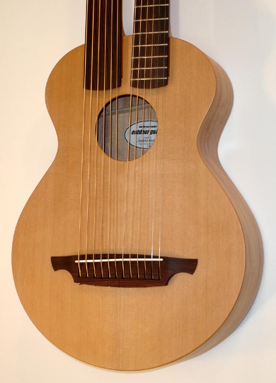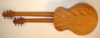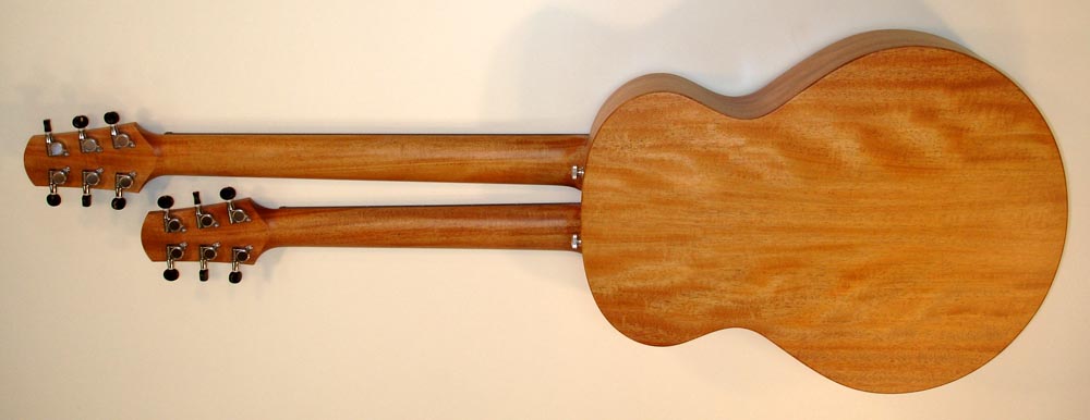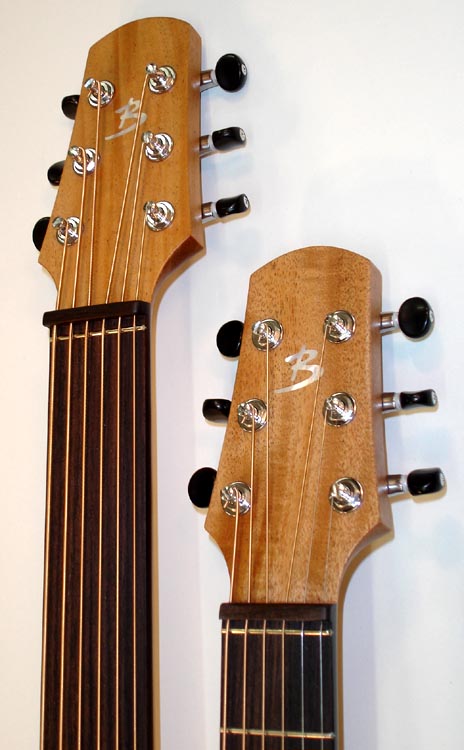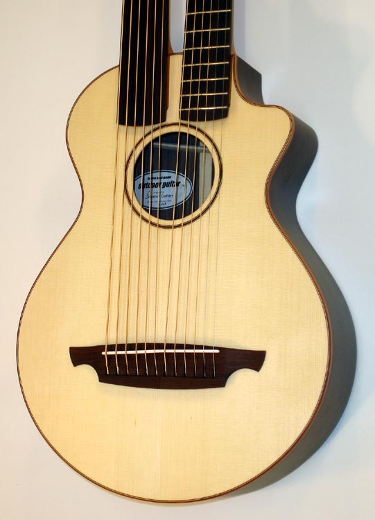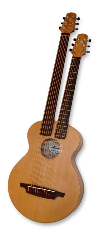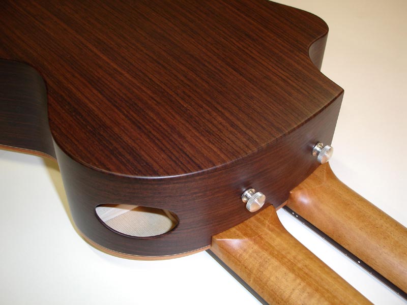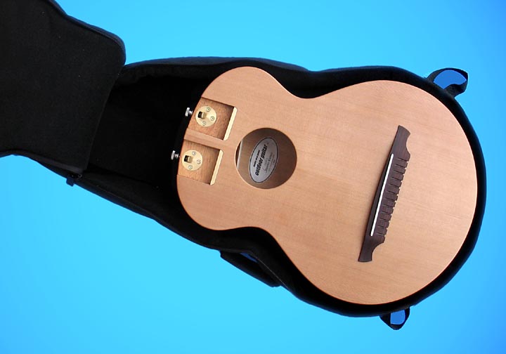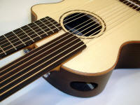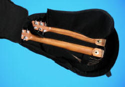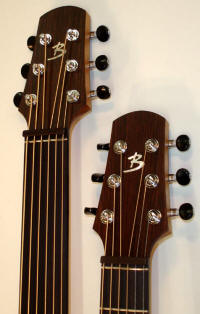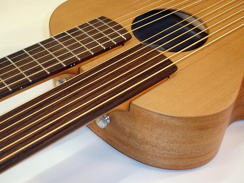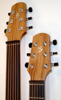 Well, someone finally went and did it. While I was brainstorming with several luthiers on how to fold that pesky Dyer arm in half, a fellow named Luke Brunner over in Switzerland built a better mousetrap. The first genuine portable travel harp guitar by Brunner Guitars! And now, forget everything you've read, heard or thought about travel guitars, because this blows them all away. A) It's not cheaply built, B) it's not too small, and C) it doesn't sound lame. It does disassemble (in literally seconds) and stow in an adorable little backpack gig bag, and can fit in most airline overhead compartments. And don't think of it as a "kit" guitar either. Though it separates into three pieces, it assembles quickly, cleanly and solidly - with almost no re-tuning required! Once assembled, what you've got is a finely crafted, professional, full-scale, small-medium bodied harp guitar....that sounds fantastic. Impossible you say? OK, check this out: First, listen to an unadulterated A/B/C comparison of the two instruments shown here compared with my vintage Dyer (below). Then, later, read the full story Lukas Brunner and the World’s First Travel Harp Guitars on Harpguitars.net. In that feature, you'll see how I was originally highly skeptical myself. You'll also understand the array of unusual, innovative features that Luke has developed to provide such amazing sound. By dumb luck, just after these arrived, the maestro himself, Stephen Bennett, stopped by for a visit. He was initially disbelieving, then tickled to see how it magically assembled. Then complete surprise when I handed it to him and it was virtually in tune! After playing each for awhile, we both admitted that we wouldn't have any problem with owning one of these - for touring, recording, anything (the price is certainly right). Our only personal caveats were the string spacing - a bit less at the nut and saddle than the Dyers we're used to - and of course the fact that we each had a fantastic harp guitar (actually, a few) already. The string spacing is of course just an observation, not in any way a negative; I readily acknowledge that the nut width preference of harp guitarists ranges from skinny Taylor widths to the full two inches of the Lark in the Morning. OK, let's discuss these in detail. These are OHG # 2 and # 3, serial numbers 163 and 164. Philippe Fouquet in France has the first one (he was the instigator of the whole serendipitous project). As the photos show, #163 (right) has a spruce top with Indian rosewood back and sides, while #164 (left) has a cedar top with mahogany back and sides. 164 was deliberately left as unadorned as possible in order to offer the public the most affordable OHG option we possibly could (price is $3500, tone is a good $7k equivalent). 163 has mid-range options - a cutaway, a sound port (I love this - it gives the impression of a hollow arm), electronics (Baggs), and wood bindings. Otherwise, they are virtually identical, each having near-identical construction, the Brunner truss rod, locking tuners, pearl headstock inlay, side fret markers, and six sub-basses (strung and tuned in Bennett tuning). For the latter, there is a larger hole drilled in the bridge for the last sub to accommodate the large ball of an acoustic bass string (i.e: one can use a .100 to get a low F or E. Currently an .080 - of either ball size - handles the low G perfectly. In fact, Luke put an .072 on # 164 and it sounds pretty good). Note: Although Philippe Fouquet has left his OHG assembled and tuned for several weeks at a time, the manufacturer recommends that the Outdoor Harp Guitar be kept disassembled in its case when not being played regularly in order to reduce long-term movement of necks, joints or top. Depending on your ultimate chosen tuning and string gauges, you may wish to make eventual adjustments to truss rods or saddle height. The scale on this "portable" harp guitar is a full standard 25-1/2" with a 1-3/4" nut width. The sub neck has a 30-1/2" scale (equivalent to the B or 4th sub of a 6-bass Dyer), a perfect compromise to handle a Bennett tuning of low to high G, or Fouquet's tuning which descends from D to F. Each has a zero fret. (If you're thinking of playing the second neck as a fretless bass or baritone guitar to flaunt a potential harp guitar organology challenge in my face, I've already thought of that! It might actually be cool. However, the necks are too close together for that to be practical.) The original Outdoor Guitars had a portable 12-1/4" wide body. Later, a second larger body size was added to the line. The harp guitars have this generous 14-1/2' body with plenty of depth (4" - same as a typical Dyer). Again, it's not the size or materials, it's how Luke has put it all together. For a complete (and fascinating) look, please visit my companion piece. Let's talk a bit more about the way the instrument comes apart and goes together. The key is the S.N.A.P. system (Simple Neck Attachment Procedure) that Luke invented and patented. This clever contraption holds the neck in position with a simple "click." By tightening the strapholder, the system is fully secured and the neck is pulled tight to the body. It comes apart just as quickly and easily. The bridge is in two parts, one glued to the body as normal, the other a removable section in which the string balls are captive. This, along with a special "through" nut and locking Gotoh tuners at the other end, allow the strings to stay at tension during assembly and disassembly. It really works! Luke recommends that the instrument be disassembled and kept in its case when not being played for long periods of time, to extend the life of the set-up and normal movement-over-time of the wood. We now pause for this commercial break...