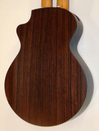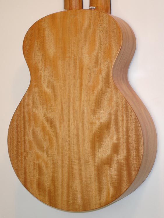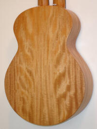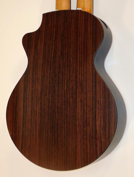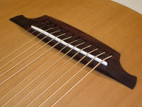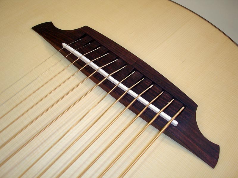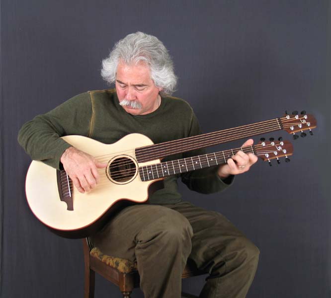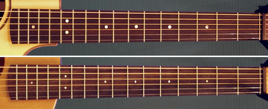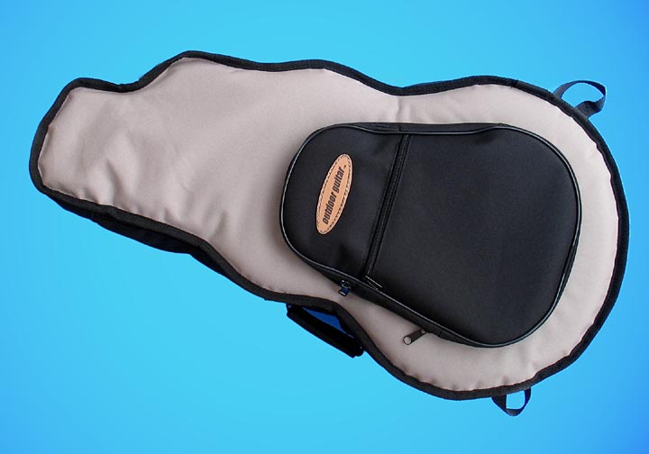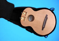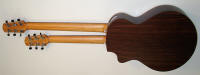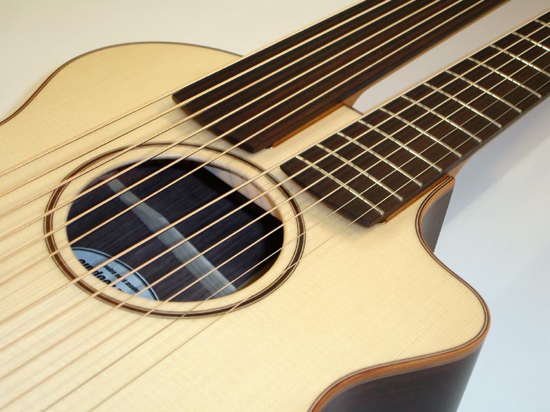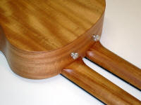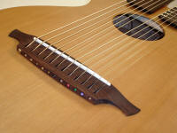 Well, someone finally went and did it. While I was brainstorming with several luthiers on how to fold that pesky Dyer arm in half, a fellow named Luke Brunner over in Switzerland built a better mousetrap. The first genuine portable travel harp guitar by Brunner Guitars! And now, forget everything you've read, heard or thought about travel guitars, because this blows them all away. A) It's not cheaply built, B) it's not too small, and C) it doesn't sound lame. It does disassemble (in literally seconds) and stow in an adorable little backpack gig bag, and can fit in most airline overhead compartments. And don't think of it as a "kit" guitar either. Though it separates into three pieces, it assembles quickly, cleanly and solidly - with almost no re-tuning required! Once assembled, what you've got is a finely crafted, professional, full-scale, small-medium bodied harp guitar....that sounds fantastic. Impossible you say? OK, check this out: First, listen to an unadulterated A/B/C comparison of the two instruments shown here compared with my vintage Dyer (below). Then, later, read the full story Lukas Brunner and the World’s First Travel Harp Guitars on Harpguitars.net. In that feature, you'll see how I was originally highly skeptical myself. You'll also understand the array of unusual, innovative features that Luke has developed to provide such amazing sound. By dumb luck, just after these arrived, the maestro himself, Stephen Bennett, stopped by for a visit. He was initially disbelieving, then tickled to see how it magically assembled. Then complete surprise when I handed it to him and it was virtually in tune! After playing each for awhile, we both admitted that we wouldn't have any problem with owning one of these - for touring, recording, anything (the price is certainly right). Our only personal caveats were the string spacing - a bit less at the nut and saddle than the Dyers we're used to - and of course the fact that we each had a fantastic harp guitar (actually, a few) already. The string spacing is of course just an observation, not in any way a negative; I readily acknowledge that the nut width preference of harp guitarists ranges from skinny Taylor widths to the full two inches of the Lark in the Morning. OK, let's discuss these in detail. These are OHG # 2 and # 3, serial numbers 163 and 164. Philippe Fouquet in France has the first one (he was the instigator of the whole serendipitous project). As the photos show, #163 (right) has a spruce top with Indian rosewood back and sides, while #164 (left) has a cedar top with mahogany back and sides. 164 was deliberately left as unadorned as possible in order to offer the public the most affordable OHG option we possibly could (price is $3500, tone is a good $7k equivalent). 163 has mid-range options - a cutaway, a sound port (I love this - it gives the impression of a hollow arm), electronics (Baggs), and wood bindings. Otherwise, they are virtually identical, each having near-identical construction, the Brunner truss rod, locking tuners, pearl headstock inlay, side fret markers, and six sub-basses (strung and tuned in Bennett tuning). For the latter, there is a larger hole drilled in the bridge for the last sub to accommodate the large ball of an acoustic bass string (i.e: one can use a .100 to get a low F or E. Currently an .080 - of either ball size - handles the low G perfectly. In fact, Luke put an .072 on # 164 and it sounds pretty good). Note: Although Philippe Fouquet has left his OHG assembled and tuned for several weeks at a time, the manufacturer recommends that the Outdoor Harp Guitar be kept disassembled in its case when not being played regularly in order to reduce long-term movement of necks, joints or top. Depending on your ultimate chosen tuning and string gauges, you may wish to make eventual adjustments to truss rods or saddle height. The scale on this "portable" harp guitar is a full standard 25-1/2" with a 1-3/4" nut width. The sub neck has a 30-1/2" scale (equivalent to the B or 4th sub of a 6-bass Dyer), a perfect compromise to handle a Bennett tuning of low to high G, or Fouquet's tuning which descends from D to F. Each has a zero fret. (If you're thinking of playing the second neck as a fretless bass or baritone guitar to flaunt a potential harp guitar organology challenge in my face, I've already thought of that! It might actually be cool. However, the necks are too close together for that to be practical.) The original Outdoor Guitars had a portable 12-1/4" wide body. Later, a second larger body size was added to the line. The harp guitars have this generous 14-1/2' body with plenty of depth (4" - same as a typical Dyer). Again, it's not the size or materials, it's how Luke has put it all together. For a complete (and fascinating) look, please visit my companion piece. Let's talk a bit more about the way the instrument comes apart and goes together. The key is the S.N.A.P. system (Simple Neck Attachment Procedure) that Luke invented and patented. This clever contraption holds the neck in position with a simple "click." By tightening the strapholder, the system is fully secured and the neck is pulled tight to the body. It comes apart just as quickly and easily. The bridge is in two parts, one glued to the body as normal, the other a removable section in which the string balls are captive. This, along with a special "through" nut and locking Gotoh tuners at the other end, allow the strings to stay at tension during assembly and disassembly. It really works! Luke recommends that the instrument be disassembled and kept in its case when not being played for long periods of time, to extend the life of the set-up and normal movement-over-time of the wood. We now pause for this commercial break...