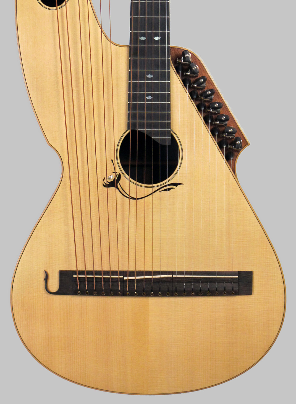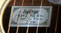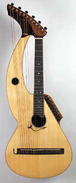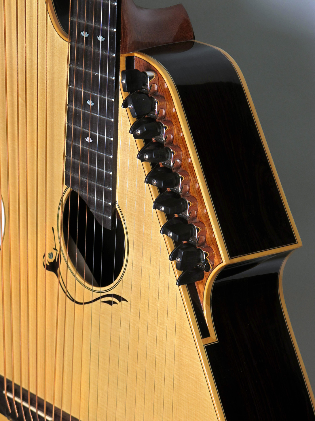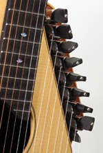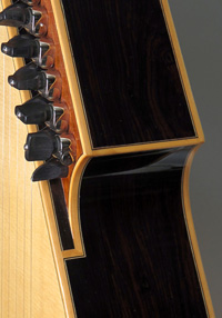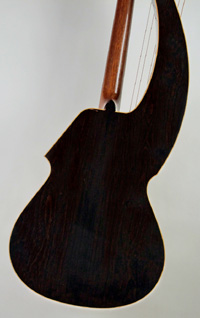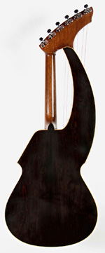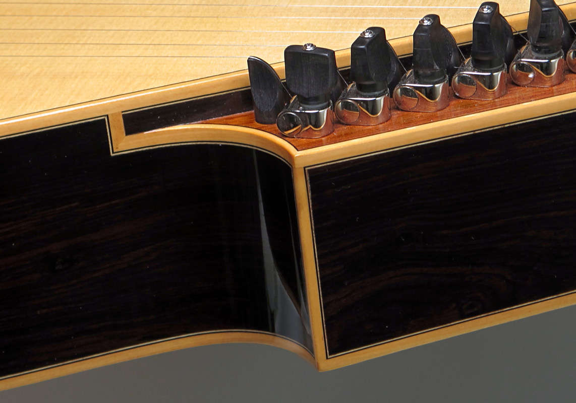 From what I can see from a quick check inside, #5 appears to follow #4’s internal features, including the complex X bracing (with through-openings in the bass bars) above 7 fan braces. I don’t really know if Sullivan was altering bracing and other construction details specifically in order to handle the customers’ requests for steel (phosphor bronze) sub-basses or to improve tone overall. Whatever his goals, he definitely got results! When I tuned this up, I couldn’t believe how loud it was, and also how responsive the top was. I subsequently discovered that it is strung extremely lightly all the way across (in comparison to Doan’s and also other steel string HGs). Yet the strings don’t feel or sound too light (other than the lowest subs, which should be beefed up) and they manage to drive the top like crazy, across all twenty strings. The neck strings remind me somewhat of a National steel or a Gypsy guitar, not in tone, but in that they seem to get louder and clearer the higher you play. As in Doan’s instrument (per his request) the high E fretted on the 12th fret of the first string sounds almost identical to the adjacent E super-treble. All the supers ring like bells; again, they are currently lighter: .009’s compared to Doan’s .012’s. The tonal characteristics of the main neck are rather hard to describe. I heard perfect overtones, Frank commented about each string’s great clarity and separation, all notes bright but never overly so. We both hear some subtle and complex dry, woody character that reminded me of lutes or Renaissance instruments. It sounds great, and not quite like anything else (not Dyer-like). Actually, I just put on Beyond Six Strings, and Iwan Hasan’s track (“Heavenly Earth Dance”) gives a good taste of this distinctive neck tone (his subs sound different, being nylon). Now we come to the subs, again, very lightly strung (they could all be increased in gauge from my experience, but only if the next owner desires it). Strung as they are in phosphor bronze, the subs are all perfectly homogenous with the neck strings; the instrument even has the coveted (and difficult to achieve – trust me) perfect transition between the low neck E and the first sub D. In fact, the entire 20-string instrument sounds like a single, continuous instrument from lowest sub to highest treble. If true piano-like consistency is your goal then this may be your holy grail. If one wanted the distinctive John Doan sound, this instrument could easily be switched over to nylon basses, and it would probably sound powerful and similarly great. You can play this instrument delicately and sweetly and you can also pound it pretty hard. It’d be fun to see this in the hands of a Hedges-style player and see what new sounds can be brought out of a 20-string! There’s some fret buzzing up high on the lower strings; again, due to the X-light gauges. The low profile bridge saddle could also be raised if desired. The neck straightness and profile are otherwise fine. Back to condition: Opening the Sullivan-built wood case (possibly airline worthy, but no guarantees), I couldn’t believe the quality and condition at first glance – but then, it’s only eight years old. There are a handful of tiny dings in the finish scattered about the top. The finish of the blackwood looks less than pristine, but Frank and I think it just needs a good polish (I’d prefer to leave that to someone else). Some random areas of “cloudiness” might perhaps be just too much wax buildup (?). There is a series of small faint cracks in the back of the arm that may be in the finish or may be in the grain of the wood. One is definitely in the wood but very tight. It/they could be glued or left alone in my opinion. The tuners all work great (once you get used to that crazy Sullivan-Elliott system). You’ll need to glue down the neck nut, which slips to the left due to the splayed string array. There is no endpin, nor electronics. Just think! You could be the “first on your block” and perhaps the last in the world to purchase a barely-used John Sullivan harp guitar for the foreseeable future. What an exciting and amazing opportunity for our harp guitar community. -Gregg "Sir Gregory" Miner |