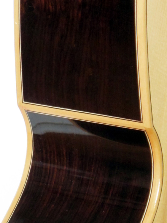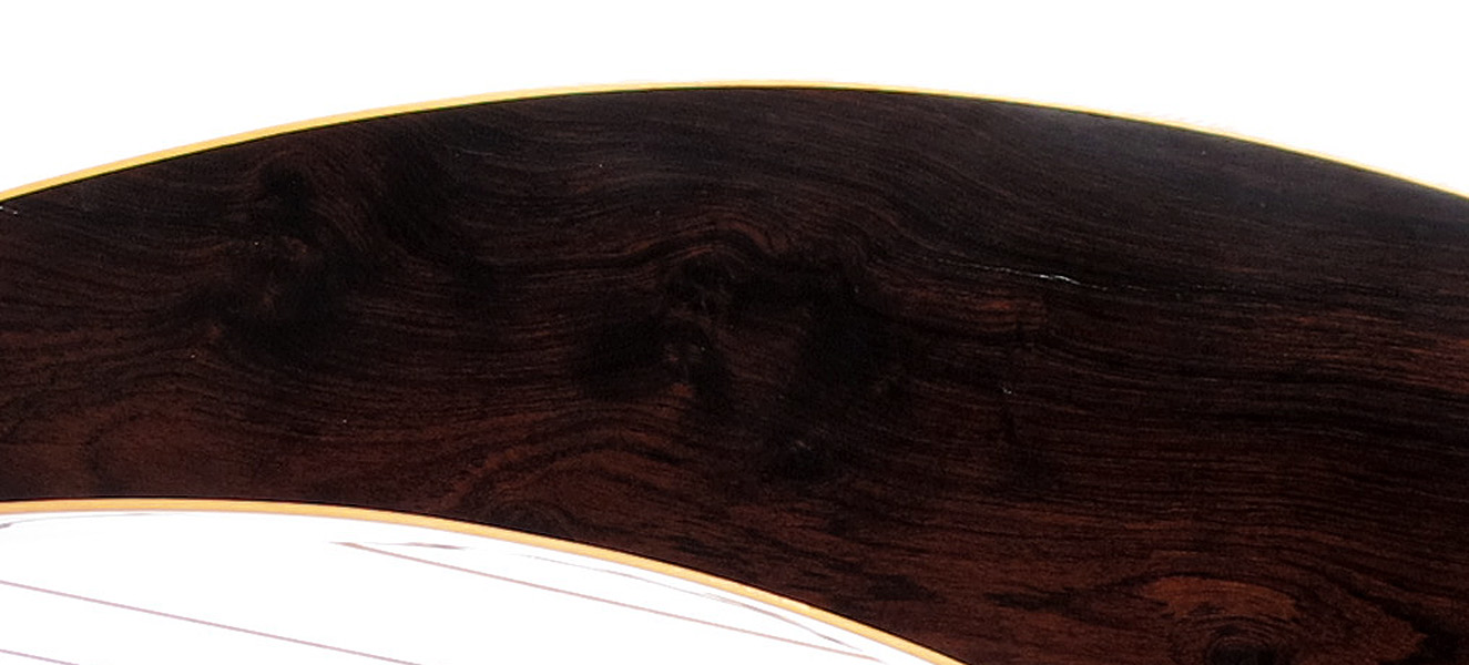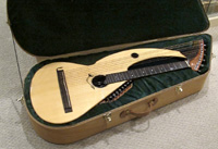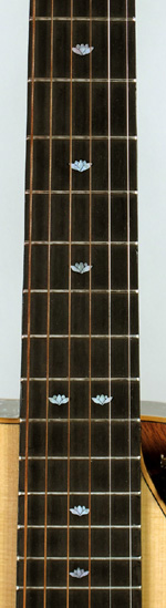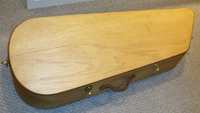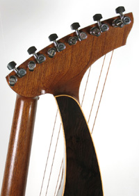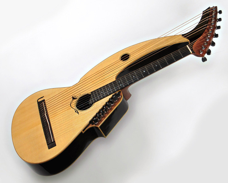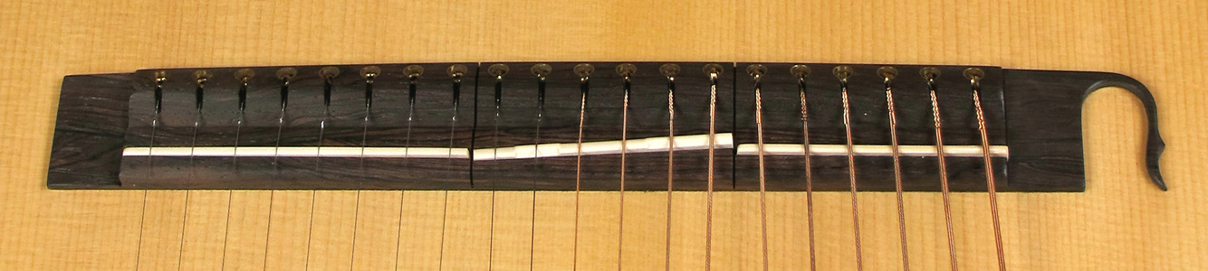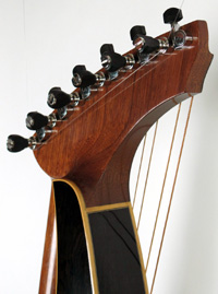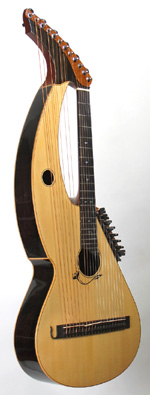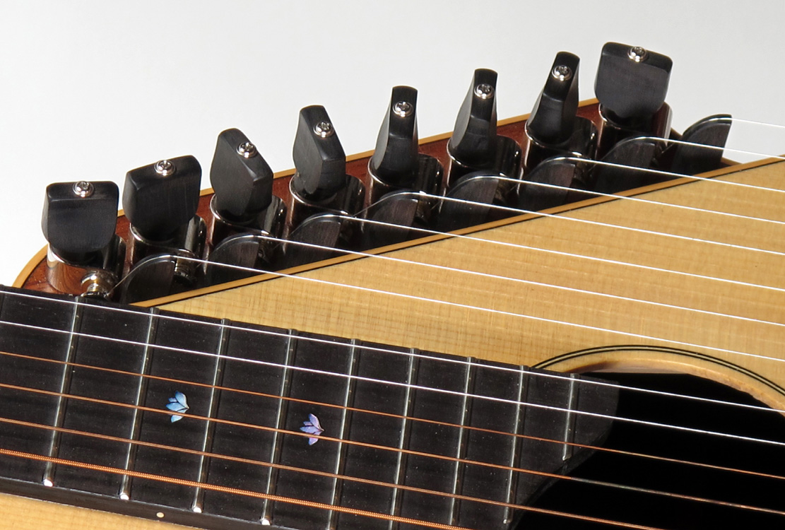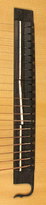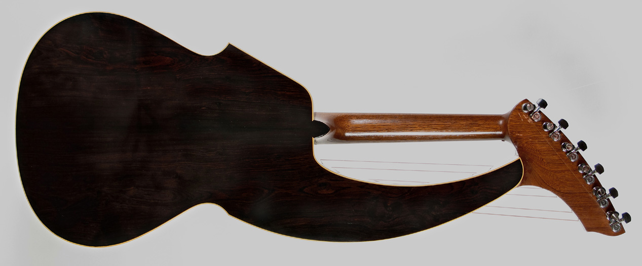 From what I can see from a quick check inside, #5 appears to follow #4’s internal features, including the complex X bracing (with through-openings in the bass bars) above 7 fan braces. I don’t really know if Sullivan was altering bracing and other construction details specifically in order to handle the customers’ requests for steel (phosphor bronze) sub-basses or to improve tone overall. Whatever his goals, he definitely got results! When I tuned this up, I couldn’t believe how loud it was, and also how responsive the top was. I subsequently discovered that it is strung extremely lightly all the way across (in comparison to Doan’s and also other steel string HGs). Yet the strings don’t feel or sound too light (other than the lowest subs, which should be beefed up) and they manage to drive the top like crazy, across all twenty strings. The neck strings remind me somewhat of a National steel or a Gypsy guitar, not in tone, but in that they seem to get louder and clearer the higher you play. As in Doan’s instrument (per his request) the high E fretted on the 12th fret of the first string sounds almost identical to the adjacent E super-treble. All the supers ring like bells; again, they are currently lighter: .009’s compared to Doan’s .012’s. The tonal characteristics of the main neck are rather hard to describe. I heard perfect overtones, Frank commented about each string’s great clarity and separation, all notes bright but never overly so. We both hear some subtle and complex dry, woody character that reminded me of lutes or Renaissance instruments. It sounds great, and not quite like anything else (not Dyer-like). Actually, I just put on Beyond Six Strings, and Iwan Hasan’s track (“Heavenly Earth Dance”) gives a good taste of this distinctive neck tone (his subs sound different, being nylon). Now we come to the subs, again, very lightly strung (they could all be increased in gauge from my experience, but only if the next owner desires it). Strung as they are in phosphor bronze, the subs are all perfectly homogenous with the neck strings; the instrument even has the coveted (and difficult to achieve – trust me) perfect transition between the low neck E and the first sub D. In fact, the entire 20-string instrument sounds like a single, continuous instrument from lowest sub to highest treble. If true piano-like consistency is your goal then this may be your holy grail. If one wanted the distinctive John Doan sound, this instrument could easily be switched over to nylon basses, and it would probably sound powerful and similarly great. You can play this instrument delicately and sweetly and you can also pound it pretty hard. It’d be fun to see this in the hands of a Hedges-style player and see what new sounds can be brought out of a 20-string! There’s some fret buzzing up high on the lower strings; again, due to the X-light gauges. The low profile bridge saddle could also be raised if desired. The neck straightness and profile are otherwise fine. Back to condition: Opening the Sullivan-built wood case (possibly airline worthy, but no guarantees), I couldn’t believe the quality and condition at first glance – but then, it’s only eight years old. There are a handful of tiny dings in the finish scattered about the top. The finish of the blackwood looks less than pristine, but Frank and I think it just needs a good polish (I’d prefer to leave that to someone else). Some random areas of “cloudiness” might perhaps be just too much wax buildup (?). There is a series of small faint cracks in the back of the arm that may be in the finish or may be in the grain of the wood. One is definitely in the wood but very tight. It/they could be glued or left alone in my opinion. The tuners all work great (once you get used to that crazy Sullivan-Elliott system). You’ll need to glue down the neck nut, which slips to the left due to the splayed string array. There is no endpin, nor electronics. Just think! You could be the “first on your block” and perhaps the last in the world to purchase a barely-used John Sullivan harp guitar for the foreseeable future. What an exciting and amazing opportunity for our harp guitar community. -Gregg "Sir Gregory" Miner |
