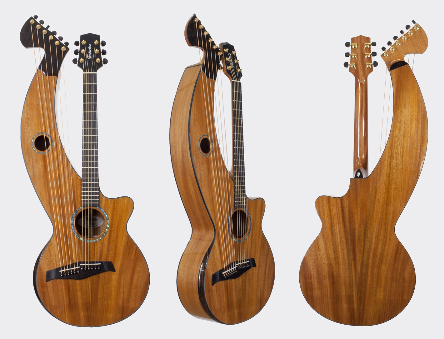 Please note that some variation in appearance may occur The many variations you see in colors and patterns on the 4 models of Timberline® harp guitars are a side effect of the gorgeous tropical hardwoods that we use for the harp guitar’s top, back and sides. They may range from light to dark, uniform to striped grain, and often feature striking sapwood effects (see examples below). The finish (satin on the T20, gloss (on the others) further accentuates the variations, as does the lighting during photography and web presentation versus “having in hand.” All are beautiful in their own way, but it makes it impossible to predict what we will see in each shipment. Currently, we do not add “up charges” to any of these, no matter how stunning we may find some, since it’s a matter of personal taste. I’m often asked to “pick the best one” (and I used to “cherry pick” the Holloway Dyers, for example), but here the striking-to-subtle variations makes it too difficult. As always, discuss this on the phone with me if you have questions or concerns. - Gregg (“Sir Gregory”) Miner |