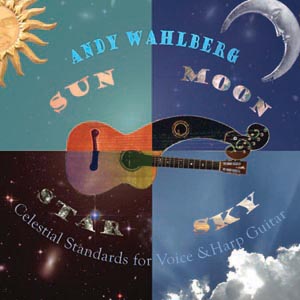 Blue Moon Harp Guitar Music is thrilled to present singer and harp guitarist extraordinaire Andy Wahlberg’s latest CD! For this special project, Andy chose 16 marvelous standards with the common “celestial” theme of the titles to create his most entertaining album yet! His charming baritone is accompanied throughout by dazzling jazz harp guitar, with the occasional harmonica, whistle, and of course his inimitable “lip trumpet.” We guarantee that you will not be able to refrain from tapping your feet, and humming these tunes long after the music has stopped. Destined to become a classic! Instrumentation is solo harp guitar; one instrumental, 15 vocals (13 sung "straight"). Co-produced by Andy and Harp Guitar Music founder Gregg Miner. "'Sun Moon Star Sky' represents a bit of a departure for Florida-reared, harp-guitarist wizard Andy Wahlberg. This 16-song collection revolves around pop standards from the 1920s, '30s, '40s and '50s whose titles contain some mention of the words in his CD's title. Hence, "Blue Moon, " "Swinging on a Star," "Sunny Side of the Street," "Blue Skies" -- you get the idea. It's surprising how many such songs exist, which makes this effort at the very least a thematic success. Wahlberg ably revisits the familiar -- Irving Berlin's "Got the Sun in the Morning" from "Annie Get Your Gun" is pure fun -- as well as the somewhat less traveled, such as Hoagy Carmichael's campy "Ole Buttermilk Sky" and a thoughtful reading of Brooks Bowman's "East of the Sun." The revelation within is this: Wahberg's a serviceable crooner, and plays it straight, for the most part. His guitar, a visual piece of artistry, largely serves to showcase the stellar compositions . . . he coaxes such a wonderful tone from his guitar, with inventive (but not intrusive) arrangements that feature walking bass lines, rhythm, and lead virtually all at once. As if that's not enough, he plays harmonica, whistles, and occasionally brings out his "lip trumpet." It all makes for a nice, laid-back package..." © Fred Kraus - minor7th.com |