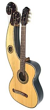 The good and the bad: Lark in the Morning harp guitars have been around for quite awhile, as the only commercially available harp guitar, period. They are approximations of the classic Dyer harp guitar, are made in Mexico, and thus a bargain compared to other professional instruments. The quality is more than adequate for an unusual instrument in this price range, and the sound is generally loud and robust, if a little lacking in finesse. Aesthetically, they are sort of halfway between a classic Dyer and a slightly gaudy classical guitar. Please note that appearance and features may vary somewhat; for instance the soundhole may be standard size or larger, as in the two images shown. The most common questions we are always asked are: How do they compare to a Dyer? and: Is it OK for professional use? To the latter – that is a matter of personal preference, but in our opinion: no, but close. The tuners should be replaced, and better players might want to have the nut and fingerboard re-dressed. The necks are not as wide as on a classical guitar, but wider and thicker than a typical modern steel-string guitar, so may not be suitable for beginners or electric guitarists. Tone-wise, nothing can compare to a Larson-built Dyer, other than some of the copies by today's best luthiers, selling for several thousand dollars. But there are many fine guitarists are out there playing Hedges’ Because It’s There perfectly well on these LIMs. Order yours now and join the growing movement! |