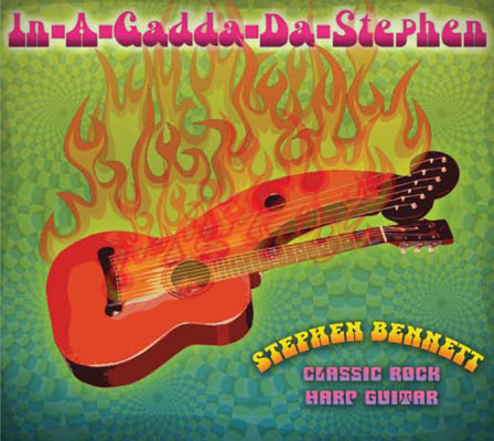 on your face." "Now that the baby boomers are aging onwards, it’s a good time to reflect back on some of the great songs that shaped our various childhoods. A fitting place to start is with a 2010 release from the pioneering Harp Guitar Music label, started up by guitar guru Gregg Miner. Miner and his label strike harp guitar gold with the 2010 CD from guitar icon Stephen Bennett, appropriately entitled In-A-Gadda-Da-Stephen. A mix of late ‘60s classics from the dawn of the golden era of ‘60s classic rock, the 15 cut In-A-Gadda-Da-Stephen might be missing the classic Iron Butterfly track for which it’s named but there's plenty more here including solo instrumental acoustic harp guitar covers of classics made famous by The Doors, Jimi Hendrix, Procol Harum, Jethro Tull, Yes, King Crimson, Rolling Stones, Cream and more. Such is Bennett’s authentic command of the acoustic harp guitar that he sounds like a virtual one man guitar army, filling in the melody and rhythm with some propulsive percussive backing—all played simultaneously on his famous acoustic harp guitar. As great as the music here sounds, one must also applaud Miner and his label for packaging the CD quite appealingly in a nostalgic ‘60s style, adding in track by track liner notes and psychedelic poster." - Robert Silverstein, Music Web Express 3000 |
