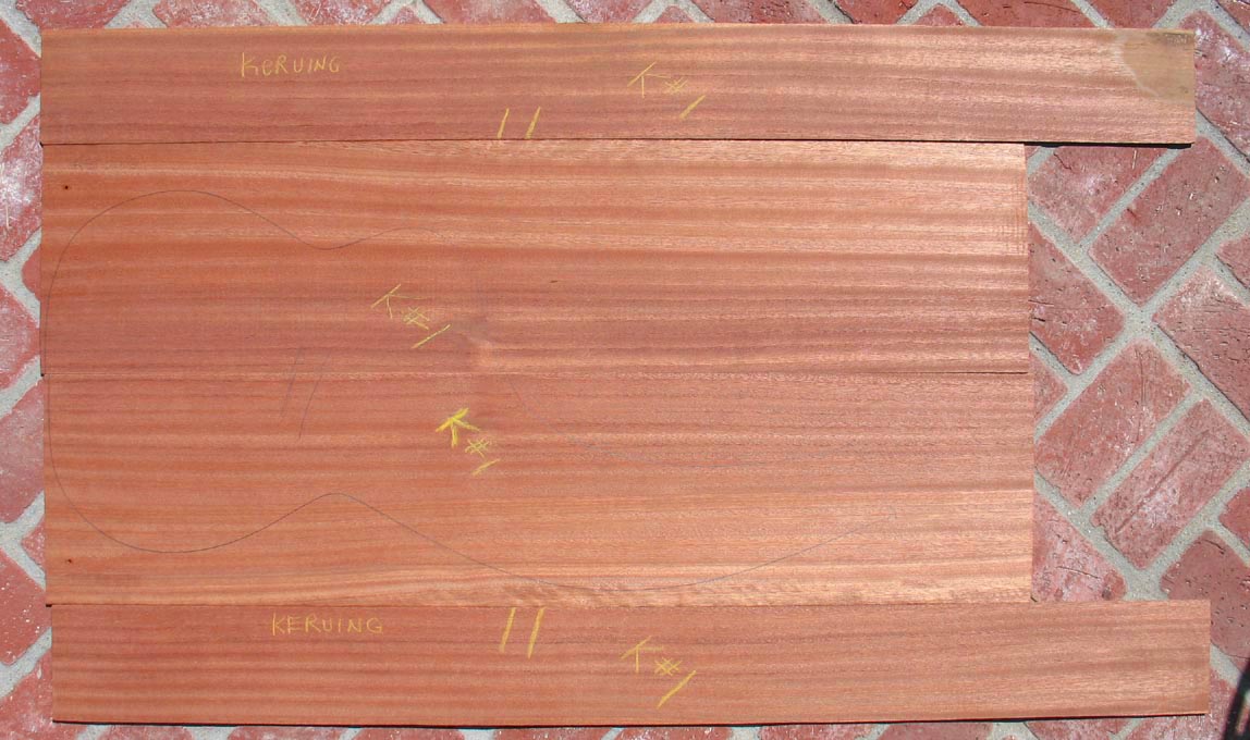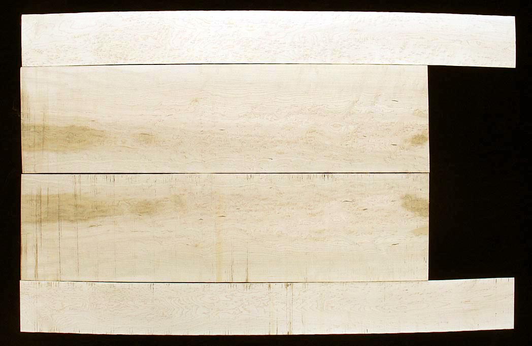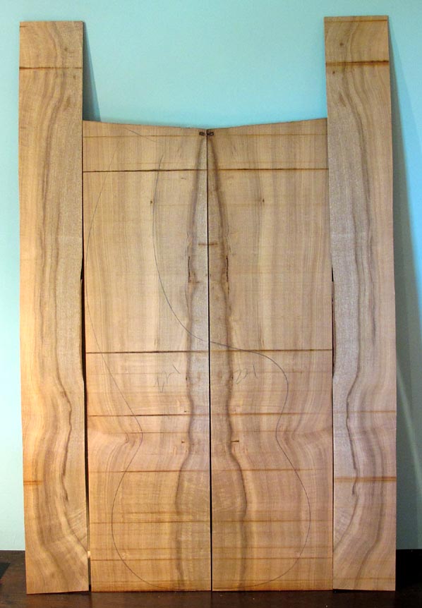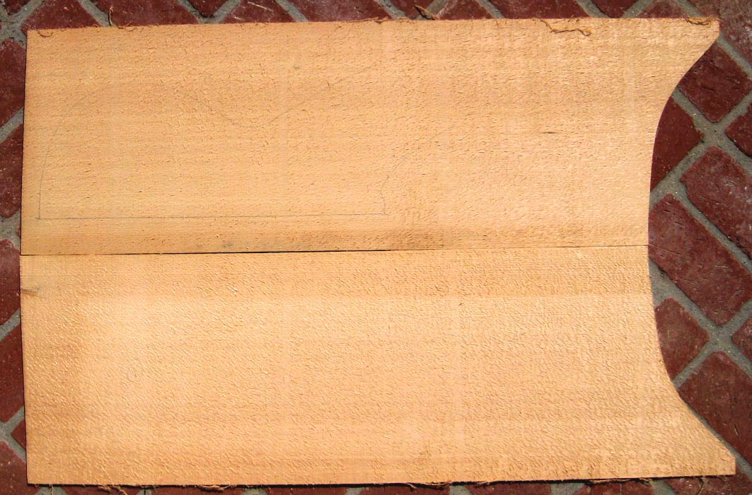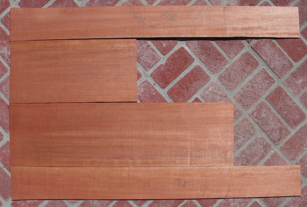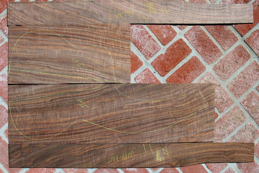 Back & Sides First up are 3 types of B&S supplied by Kerry Char. Kerry is not a wood supplier, but an expert builder and restorer. He is one of the very few to answer the call to help obtain and provide wood in the correct size for Dyer (or other) harp guitars. Having built Dyer copies, Kerry knows exactly how to utilize and cut planks to optimize material for harp guitars. Some are cut utilizing his ingenious "L" pattern, which can often yield 2 sets where others would only find one. A nice bookmatch is always maintained. All this wood is dry and ready to build, thicknessed and sanded to ~ 3/16". Pictured sets are in hand (shipped from 91367); additional similar sets can be shipped from 92503.